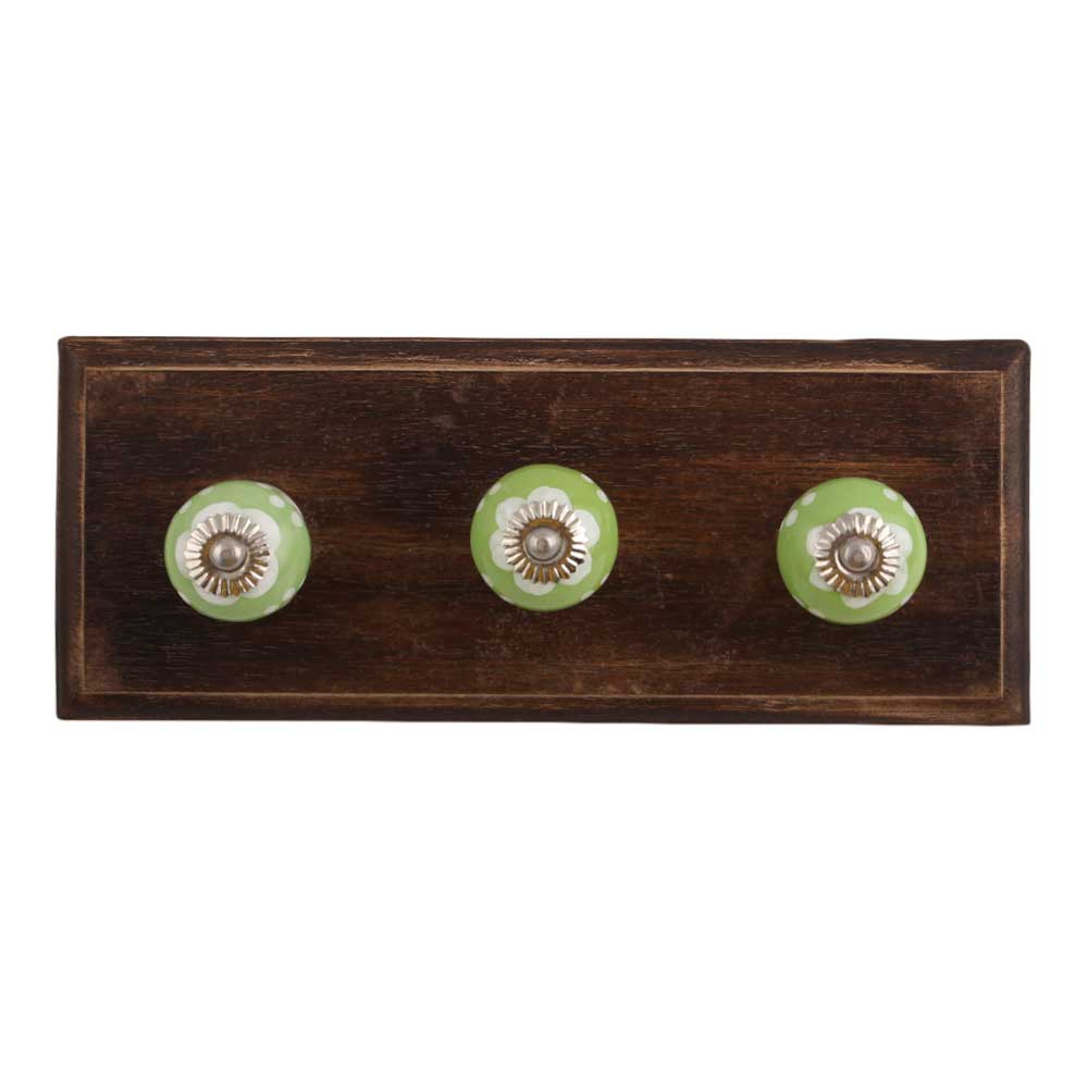 Soft Green Ceramic Wooden Hook. A Perfect Complement to the Soft Tone of the Wood are these White Traditional Hat & Coat Hook Made of Genuine Porcelain and Brass. It can be use to Hang Jewellery, Leashes, Towels, Scarves, Light Weight Sweaters, Caps Etc.