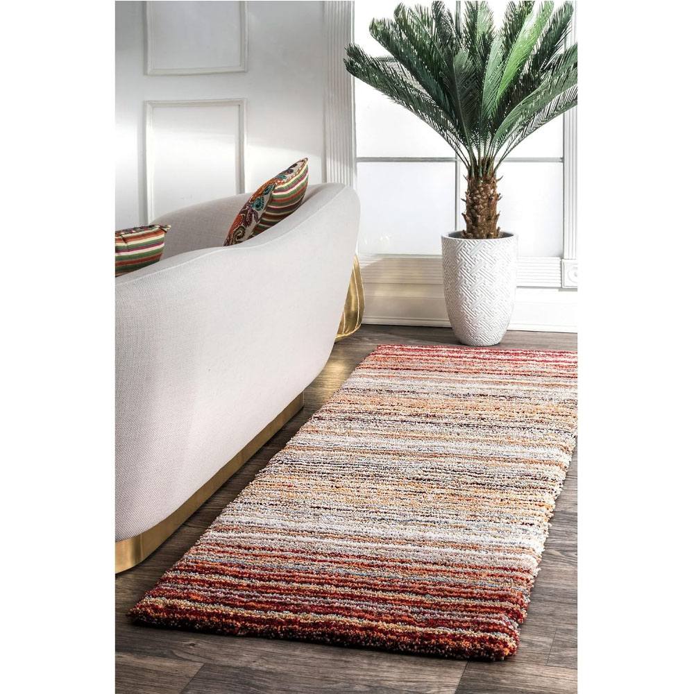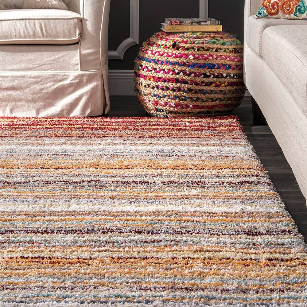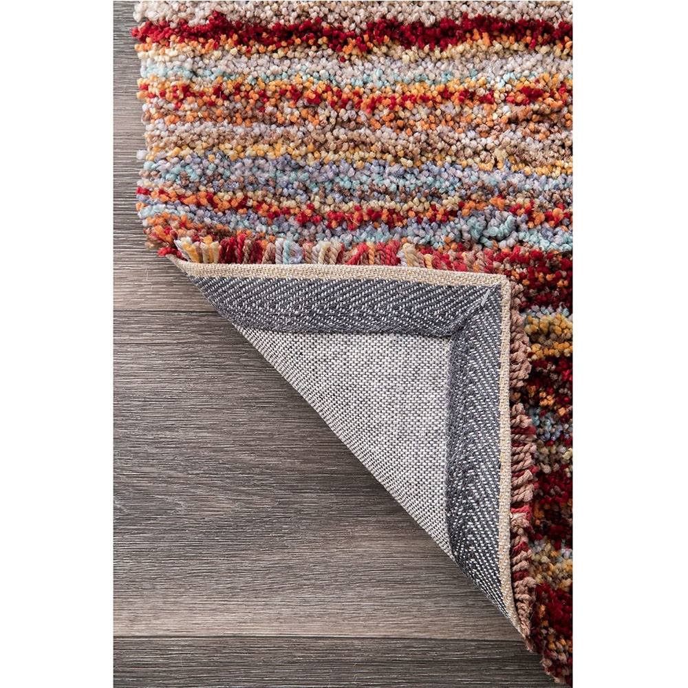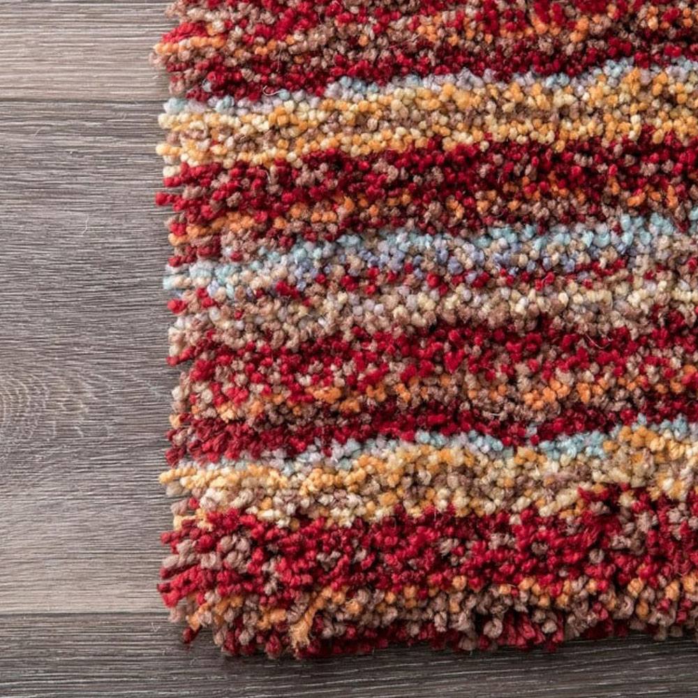 This Red Multicolor shaggy rug made from soft microfiber brings a vibrant yet earthy tone to your interiors. With warm horizontal stripes in shades of red, beige, orange, and grey, it adds dimension and texture to any room. Each rug is handcrafted, packed, and quality-checked by skilled Indianshelf artisans.
