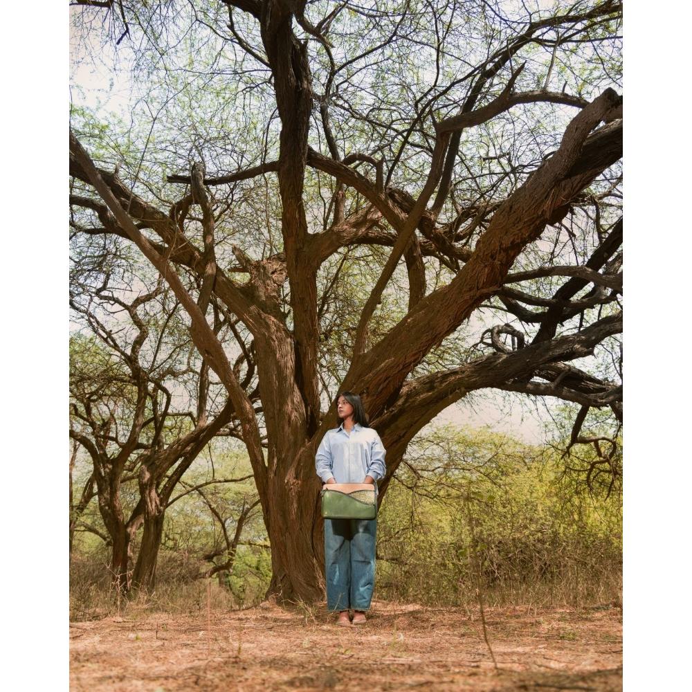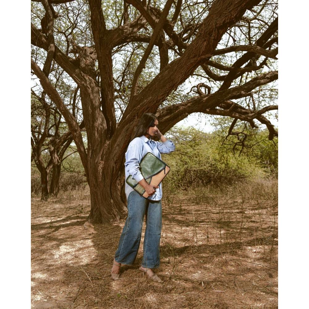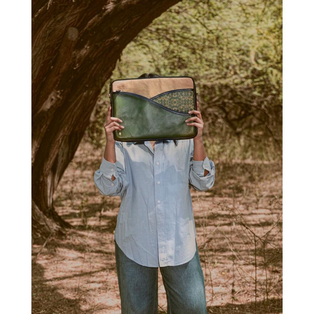This sophisticated green vegan leather laptop sleeve embodies sophisticated and vegan leather craftsmanship. Ideal for decor enthusiasts wanting an artisanal touch, it offers a statement of style and function. Packed & quality-checked by Indianshelf.