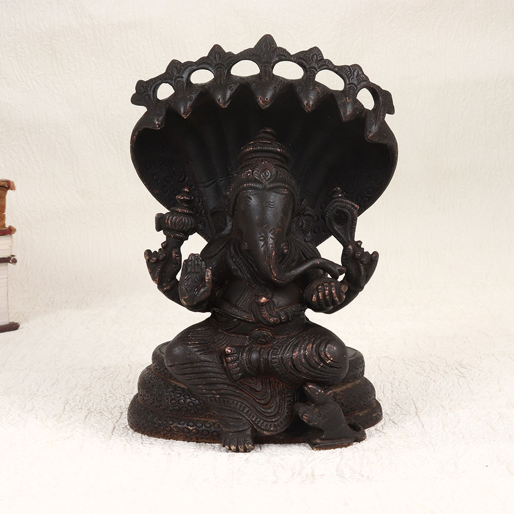 Immerse your space in divine elegance with our vintage brass statue of Lord Ganesha seated gracefully under the protective canopy of Sheshnag. Handcrafted by skilled Indian artisans in the time-honoured tradition of South Indian Art, this masterpiece exudes timeless charm with its dark finish. Crafted from high-quality brass, each detail is meticulously shaped, showcasing the artisan's dedication to perfection. This captivating Lord Ganesha statue is versatile, adding a touch of spirituality to your home, office, restaurant, hotel, or cafe prayer room. Its intricate design and vintage allure make it an ideal decorative piece, seamlessly blending tradition with sophistication. Elevate your collection of vintage treasures or present it as a thoughtful gift to your family, friends or relatives on special, festive, or auspicious occasions.