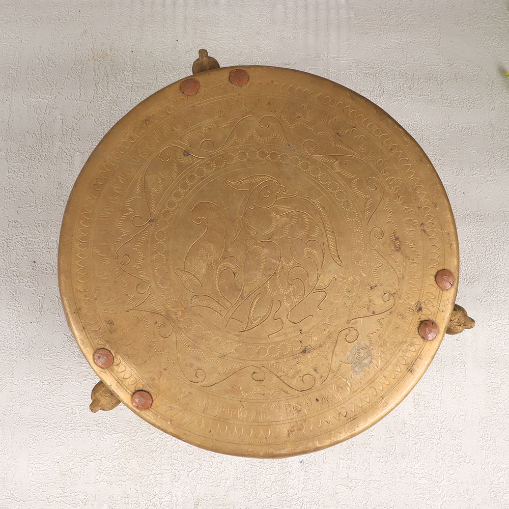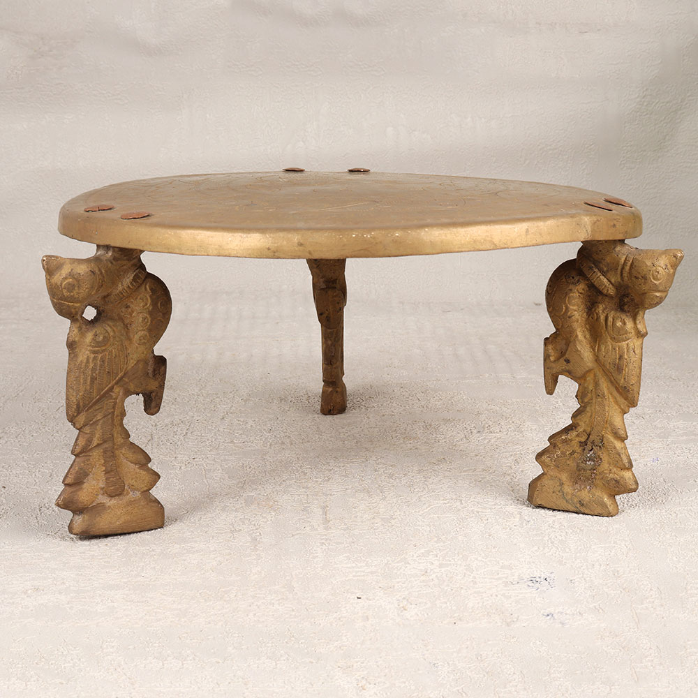 Buy a Small Brass Table online that is a testament to the craftsmanship of talented Indian artisans steeped in the rich heritage of South Indian Art. Meticulously handcrafted, this table stands as a symbol of tradition and artistry, showcasing a seamless blend of elegance and functionality. The table's three legs are intricately designed and feature beautiful engravings that tell a story of cultural significance. Its antique brown finish adds a touch of vintage charm, creating a timeless piece that effortlessly complements any interior. Crafted from finest-quality brass, the table boasts durability and a luxurious aesthetic, making it a versatile addition to your home, office, restaurant, hotel, or cafe. This masterpiece serves not only as a functional piece of furniture but also as a captivating decoration, enhancing the aesthetic appeal of any space. Whether adorning your living room, office lobby, or dining area, this small brass table is a conversation starter. Moreover, it serves as an exceptional gift for your family, friends or relatives on special, festive, or auspicious occasions. Give the gift of artistry and tradition with this handmade marvel that transcends time and resonates with cultural significance.