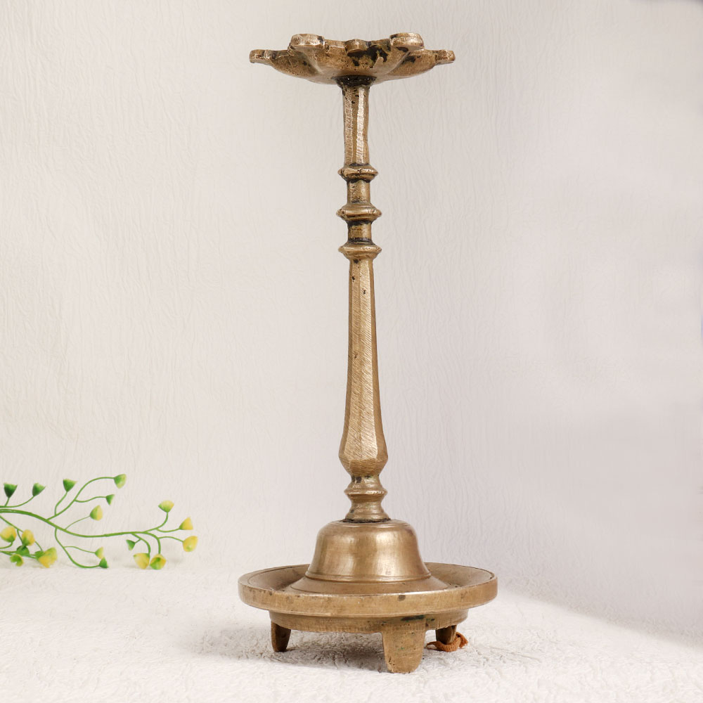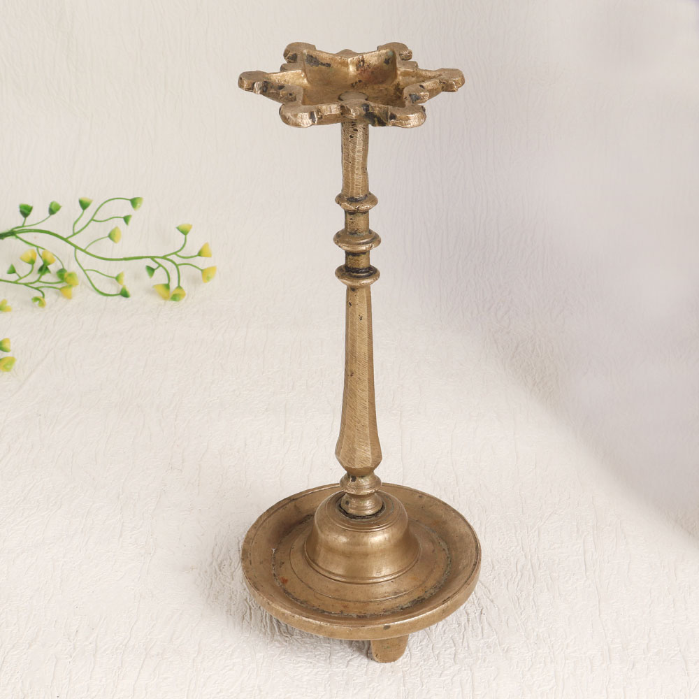 This Vintage Brass Oil Lamp is a timeless masterpiece that embodies the rich heritage of South Indian craftsmanship. Handcrafted with precision and care by skilled Indian artisans, this exquisite lamp showcases the intricate details of South Indian Art. Crafted from high-quality brass, this lamp boasts an antique brown finish that exudes warmth and character. Featuring six flame holders, it can be lit simultaneously using traditional fuels like mustard oil or desi ghee, paired with cotton wicks. This versatile lamp serves as a captivating addition to any setting, be it at home, in the office, a restaurant, hotel, cafe, or shop. Its soft, ambient glow not only elevates the atmosphere but also adds a touch of old-world charm. Perfect for enhancing the spirituality of your prayer room or temple, this lamp radiates a divine aura during religious rituals. It's also an ideal addition to your vintage collection or exhibition display, showcasing the artistry of a bygone era. Celebrate special, festive, or auspicious occasions by gifting this Vintage Brass Oil Lamp to your family, friends or relatives.