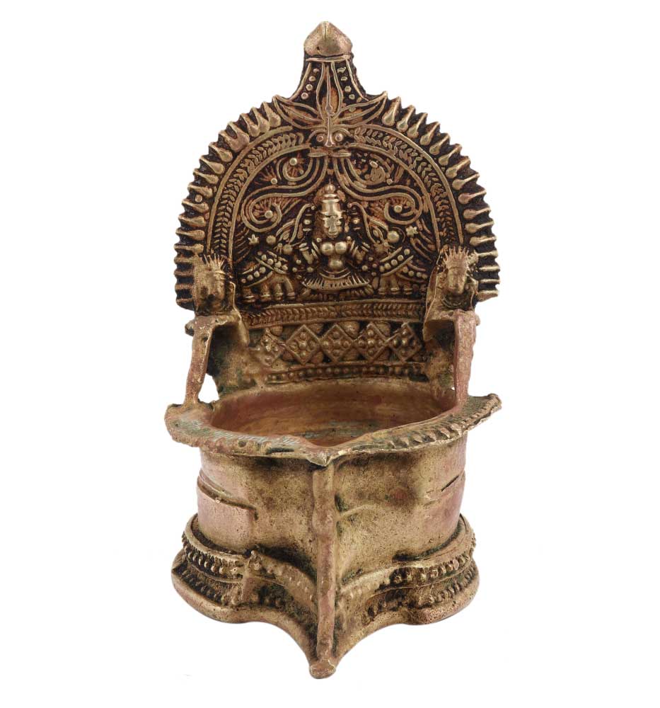 Brass Oil lamp with gajlaxmi and two jumbo elephants with fine engravings and a storage diya that can be filled with oil , ghee with a single wick. Diwali function, engagement, inauguration ceremonies, family functions, religious ceremonies etc, gift for your near and dear ones.