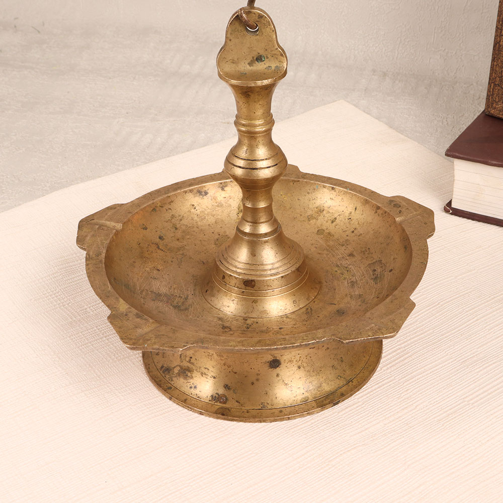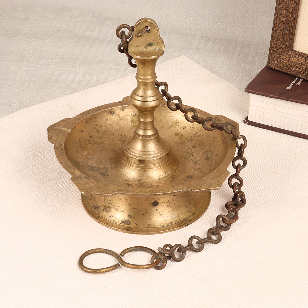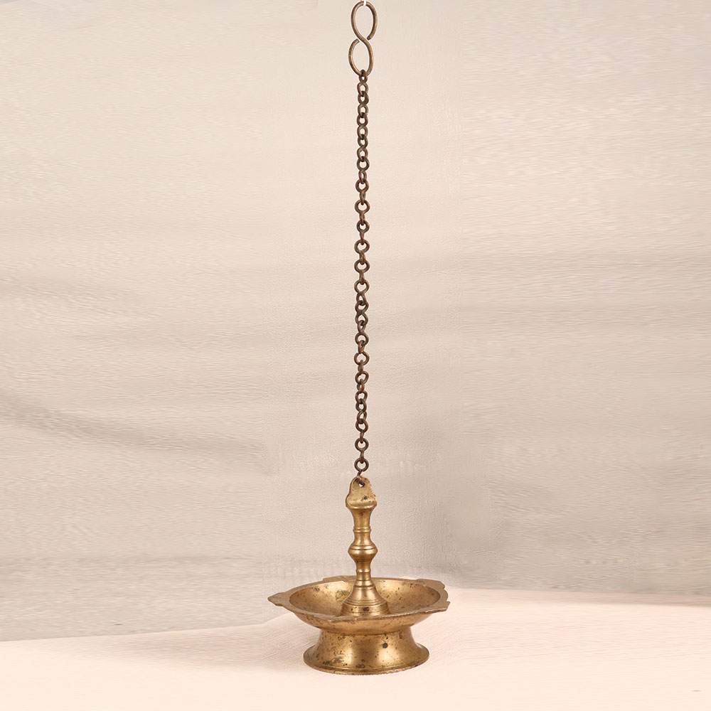 Enhance the ambiance of your space with our Vintage Brass Hanging Oil Lamp. This timeless piece with an antique brown finish is a symbol of craftsmanship and heritage. Handmade by highly skilled Indian artisans specializing in South Indian Art, this lamp is crafted from high-quality brass, ensuring durability and authenticity. Designed to hold five jyots simultaneously, the lamp allows you to illuminate your surroundings with the warm glow of mustard oil or ghee using cotton wicks. Light it during special occasions, auspicious events, or prayer sessions to create a serene atmosphere that radiates positive vibes. Versatile and elegant, this hanging oil lamp is suitable for various settings, including homes, offices, restaurants, hotels, cafes, and prayer rooms. Enhance your vintage collection or gift this masterpiece to your family, friends or relatives on special, festive, or auspicious occasions.