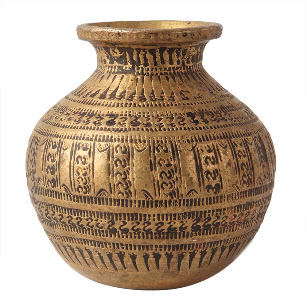 A circular decorative brass water jar that holds drinking water has been expertly engraved with hand-crafted artwork throughout. Excellent hand carving work produced by skilled artisans. Decorate your kitchen with it or place it beside your dining area as a display unit. On a coffee table, it can also serve as a flower container.