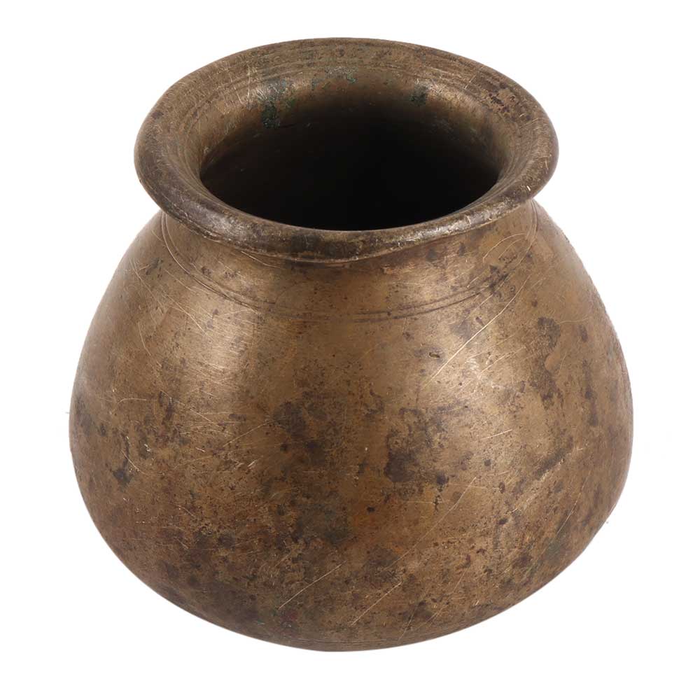 This south indian style brass water storage pot has a large belly, a wide base, and a small mouth. The wide base provides perfect balance so that it remains stable when placed on the floor. The small mouth allows for easy flow when transferred to another vessel. Use it for decoration or as a planter pot.