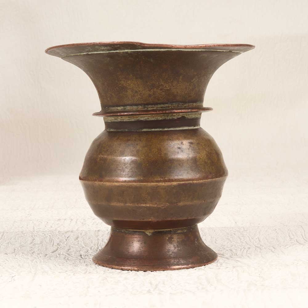 Showcase the artistry of South Indian metalwork with this ornate vintage brass flower pot. Handcrafted brass has been shaped into flowing floral and geometric designs, displaying the intricate patterns of the region. With its unpolished patina, this pot has an antiqued look and feel. The rich, organic patina and artisanal designs give this pot a worldly, bohemian vibe perfect for global-inspired decors. Its handsome brass form makes a striking decorative accent and is sure to spark conversation. For plant lovers, it brings artistic flair to greenery and succulents. With its ornate handcrafted quality, this pot makes a special addition to any home. Its global artisan appeal makes it a wonderful gift for world travellers, vintage collectors, or anyone who appreciates cultural crafts. Place it in an entryway, patio, or living space to add a touch of exotic elegance. For those drawn to artistic, ornamental pieces, this flower pot delivers artisanal allure.