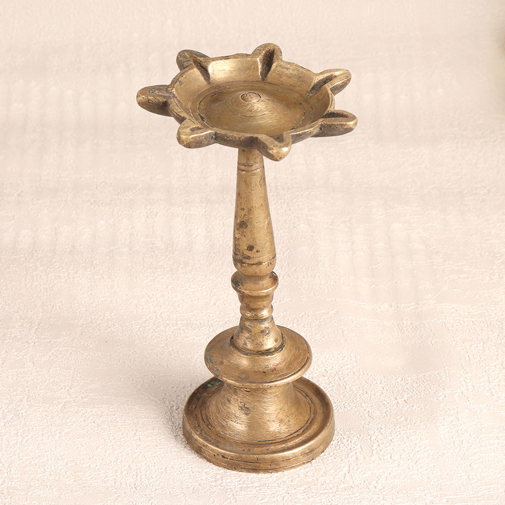 Adorn your ambiance with the timeless allure of our Vintage Brass Oil Lamp with 7 Jyots. This exquisite piece harks back to a bygone era, carefully handmade by highly skilled and experienced Indian artisans following the traditions of South Indian Art. Crafted from premium brass, it boasts an antique brown finish that exudes an aura of classic elegance. The lamp's seven jyots provide a radiant glow when ignited with mustard oil or ghee and cotton wicks, casting a warm, inviting light. This versatile piece is a splendid addition to any setting, be it your home, office, hotel, cafe, shop, or restaurant prayer room. Its intricate design makes it perfect for decorative purposes and an invaluable addition to any vintage collection or exhibition display. Beyond aesthetics, this lamp holds cultural and spiritual significance, making it ideal for use during prayers or auspicious occasions. It also serves as a thoughtful and meaningful gift for your family, friends or relatives during special festivals or moments of significance.