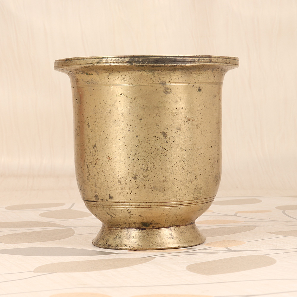 Immerse yourself in the rich tradition of South Indian spirituality with this stunning vintage brass holy water cup. Crafted with meticulous attention to detail, this captivating vessel is a true work of art that will transform your daily rituals. This holy water cup is more than just a functional item - it's a tangible connection to the spiritual legacy of South India. Incorporating this piece into your daily practice will elevate your mindfulness and deepen your sense of reverence. Whether you're an experienced devotee or exploring the path of spirituality, this cup will become an indispensable companion on your journey. Imagine the feeling of cool, consecrated water flowing through your fingers as you perform your ablutions. Picture the way the soft light reflects off the gleaming brass, creating an atmosphere of tranquility and focus. This holy water cup is designed to be a cherished heirloom, passed down through generations as a reminder of the timeless wisdom of South Indian tradition.
