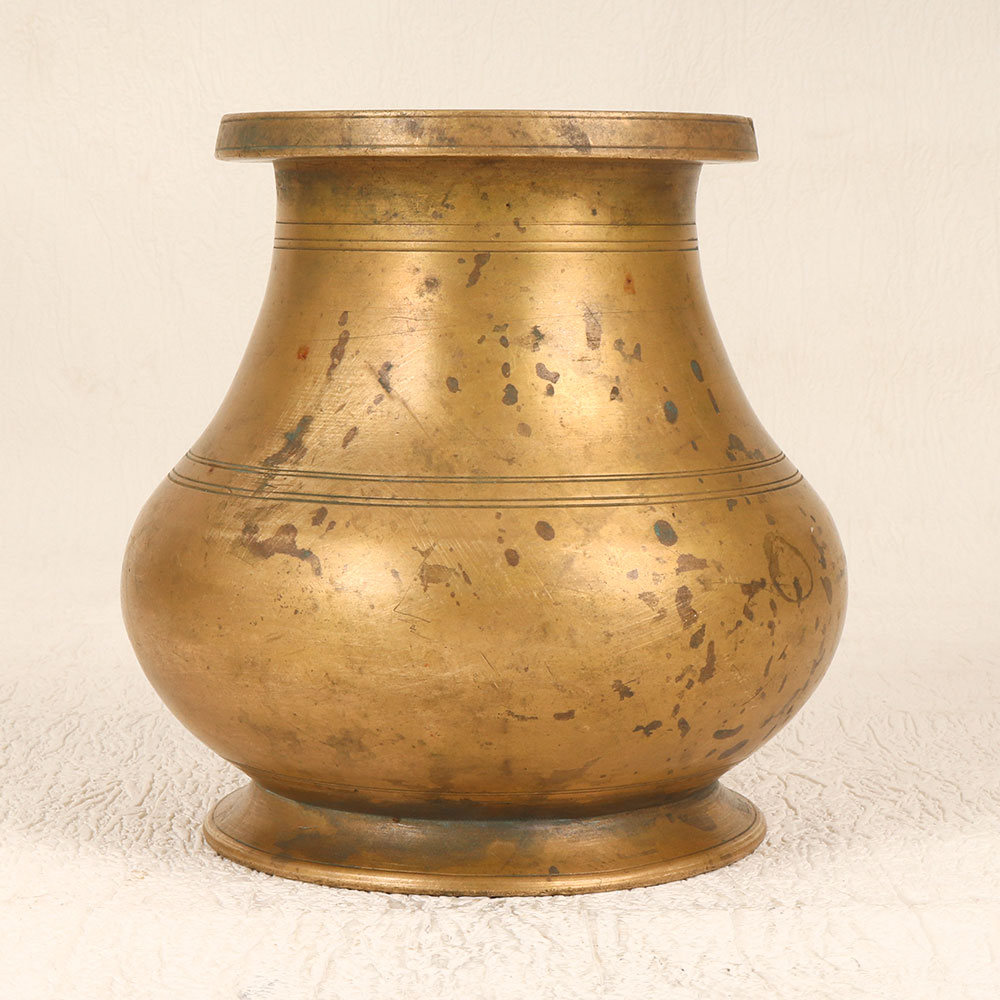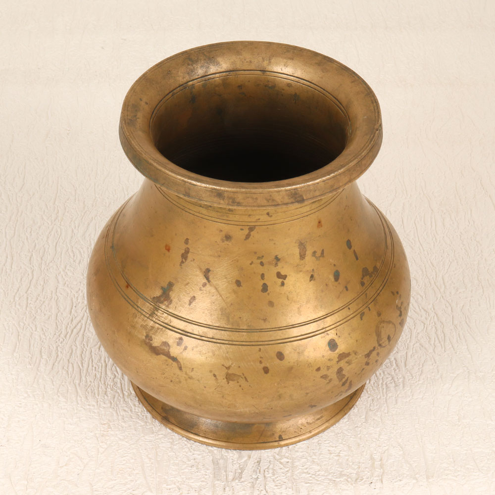 A Vintage Brass Holy Water Pot which is a testament to divine craftsmanship and timeless elegance. Handcrafted by professional Indian artisans in the revered South Indian Art tradition, this pot is a sacred vessel designed for prayer, rituals, and havans. Crafted from high-quality brass, it boasts an antique brown finish, adding a touch of vintage charm to any environment. The pot transcends its religious significance and doubles as an indoor flower pot, seamlessly blending spirituality with aesthetics. Its versatile nature makes it a perfect addition to home prayer rooms, offices, restaurants, hotels, or cafes. Imbued with cultural richness, it not only serves a functional purpose but also becomes a cherished piece for vintage collectors. Celebrate special, festive, or auspicious occasions by gifting this timeless masterpiece to your family, friends or relatives.