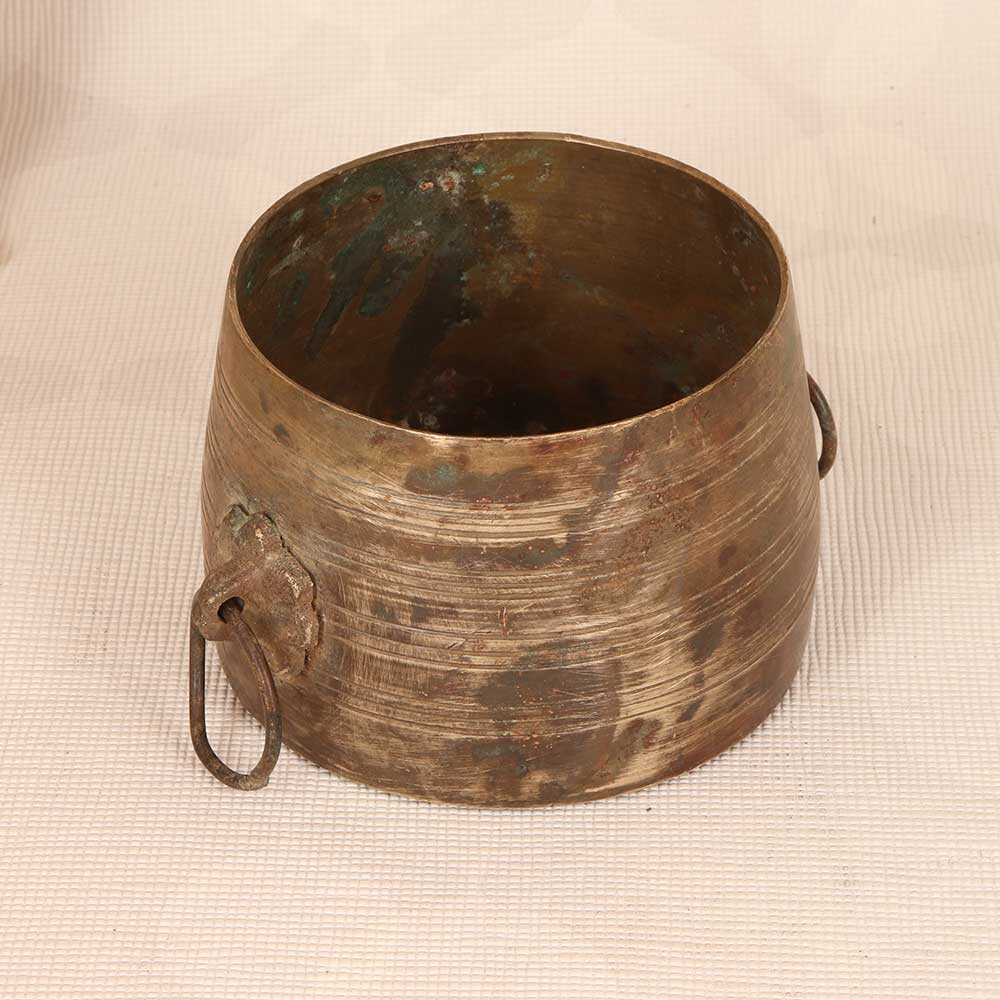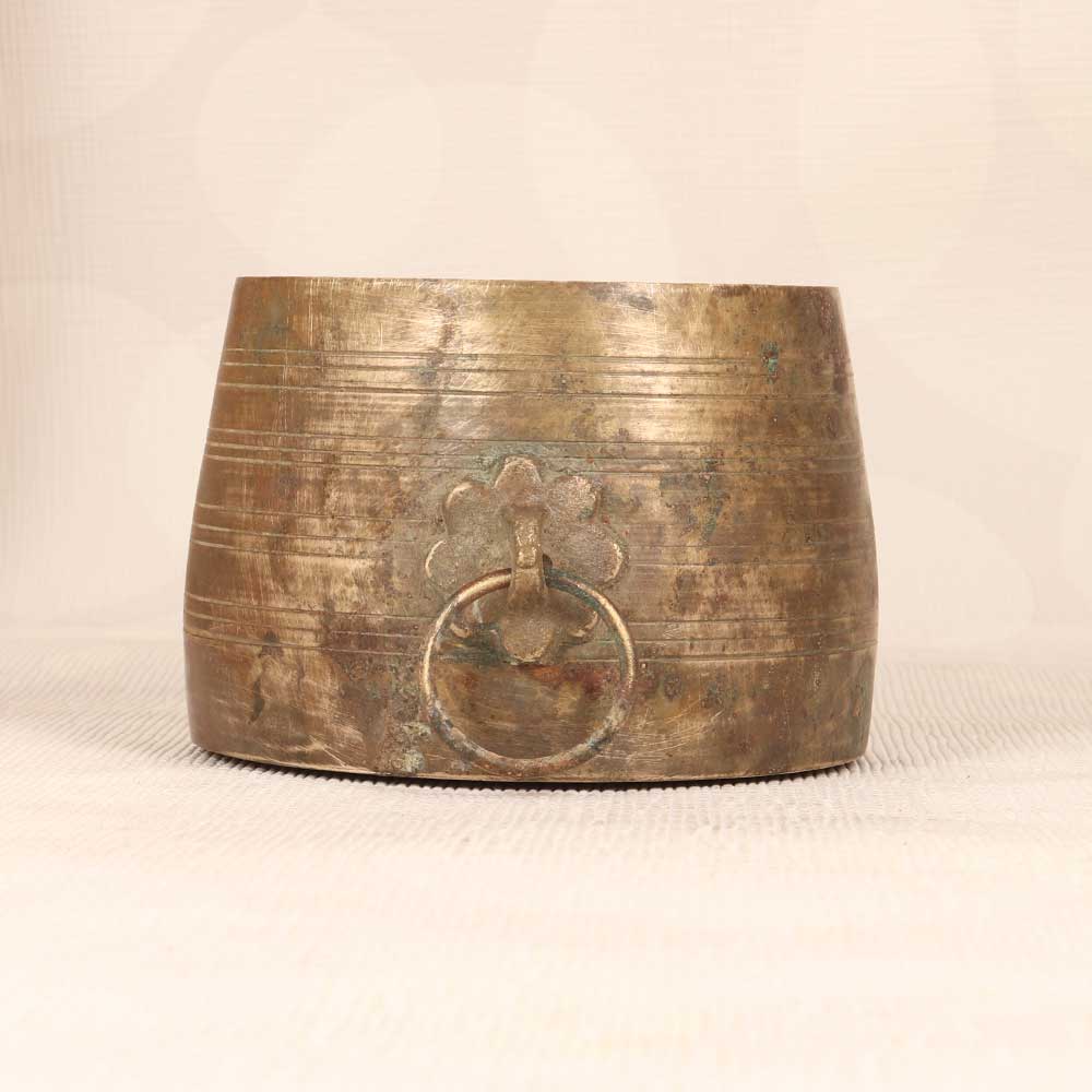 Add exotic flair with the antique brass measurement bowl. This handcrafted bowl hails from South India where it was traditionally used for portioning rice before cooking. Its hammered brass exterior and etched measurements provide a glimpse into the past. Showcase this bowl to infuse your home with rustic, vintage charm. Its engraved numbers and pleasing patina lend unique character to coffee tables, shelves or countertops. Display it in your kitchen or living room to complement farmhouse, industrial and exotic decors. Though no longer suited for food use, this solid brass bowl remains a decorative treasure. Its artisanal craftsmanship and antiqued look from a bygone era create an eye-catching antique accent piece for your home. Let its rich patina and handcrafted style transport you back in time.