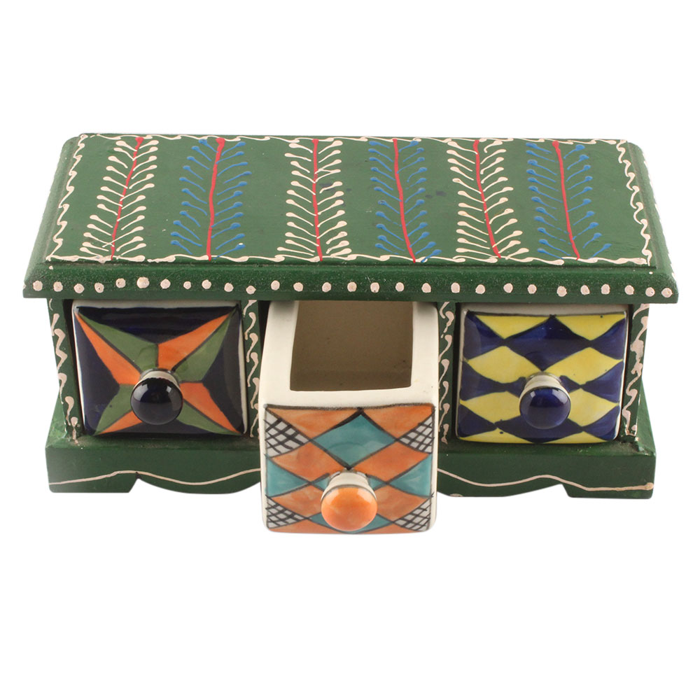 Spice Box-1441 Masala Rack Container Gift Item. Ceramic Drawers in Wooden Frame. The Spice Boxes are designed with different patterns. These boxes are made using natural wood which does not harm the purity of spices.