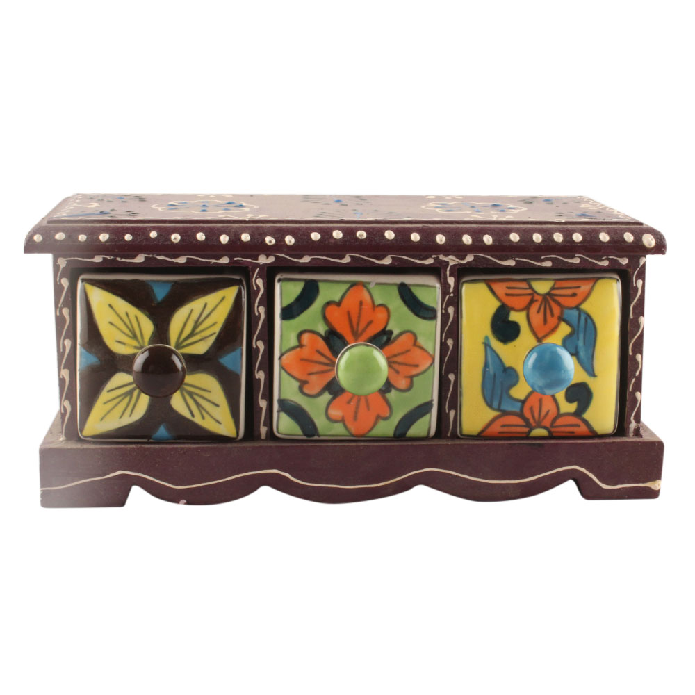 Spice Box-1445 Masala Rack Container Gift Item. Ceramic Drawers in Wooden Frame. The Spice Boxes are designed with different patterns. These boxes are made using natural wood which does not harm the purity of spices.