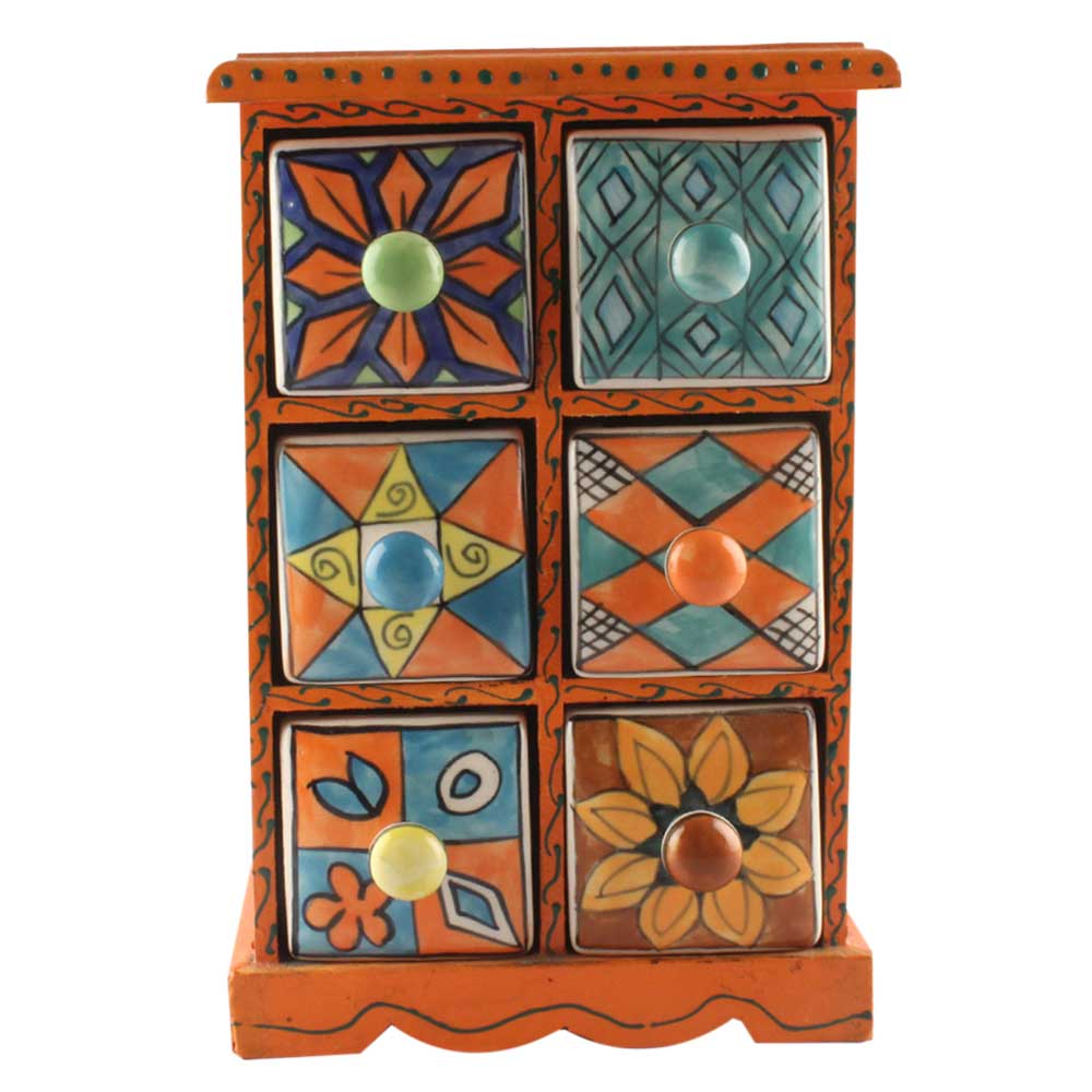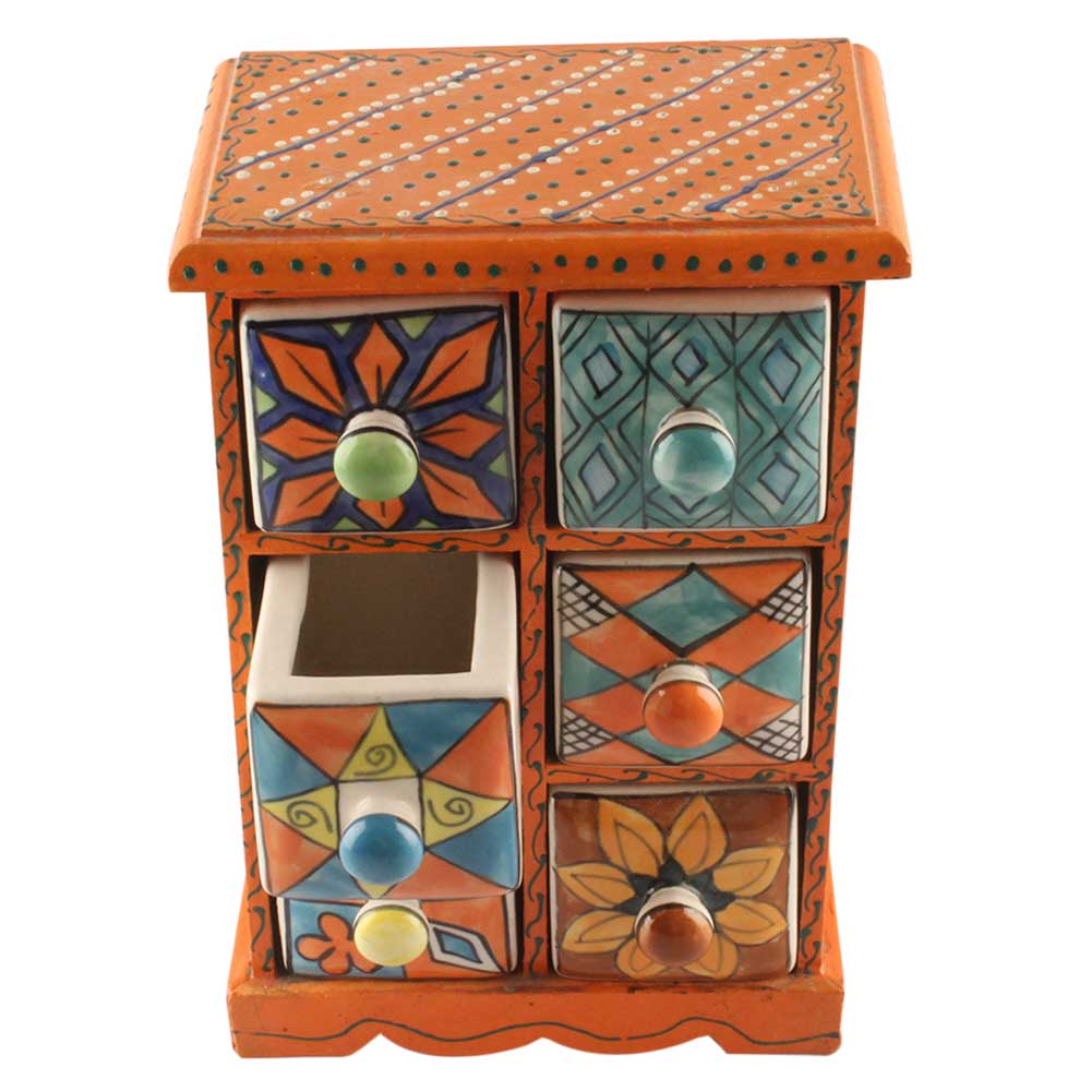 Spice Box-1471 Masala Rack Container Gift Item. Ceramic Drawers in Wooden Frame. The Spice Boxes are designed with different patterns. These boxes are made using natural wood which does not harm the purity of spices.