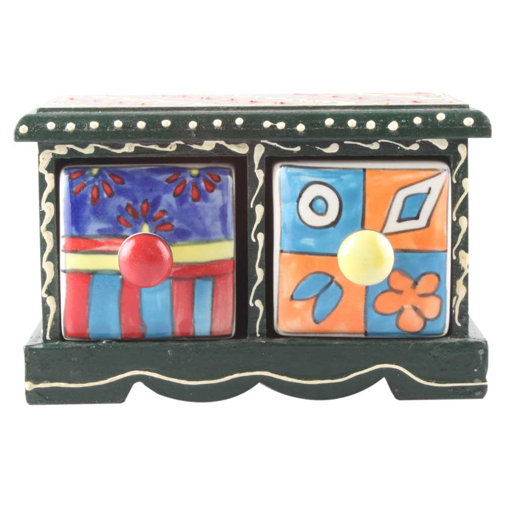 Spice Box-1477 Masala Rack Container Gift Item. Ceramic Drawers in Wooden Frame. The Spice Boxes are designed with different patterns. These boxes are made using natural wood which does not harm the purity of spices.