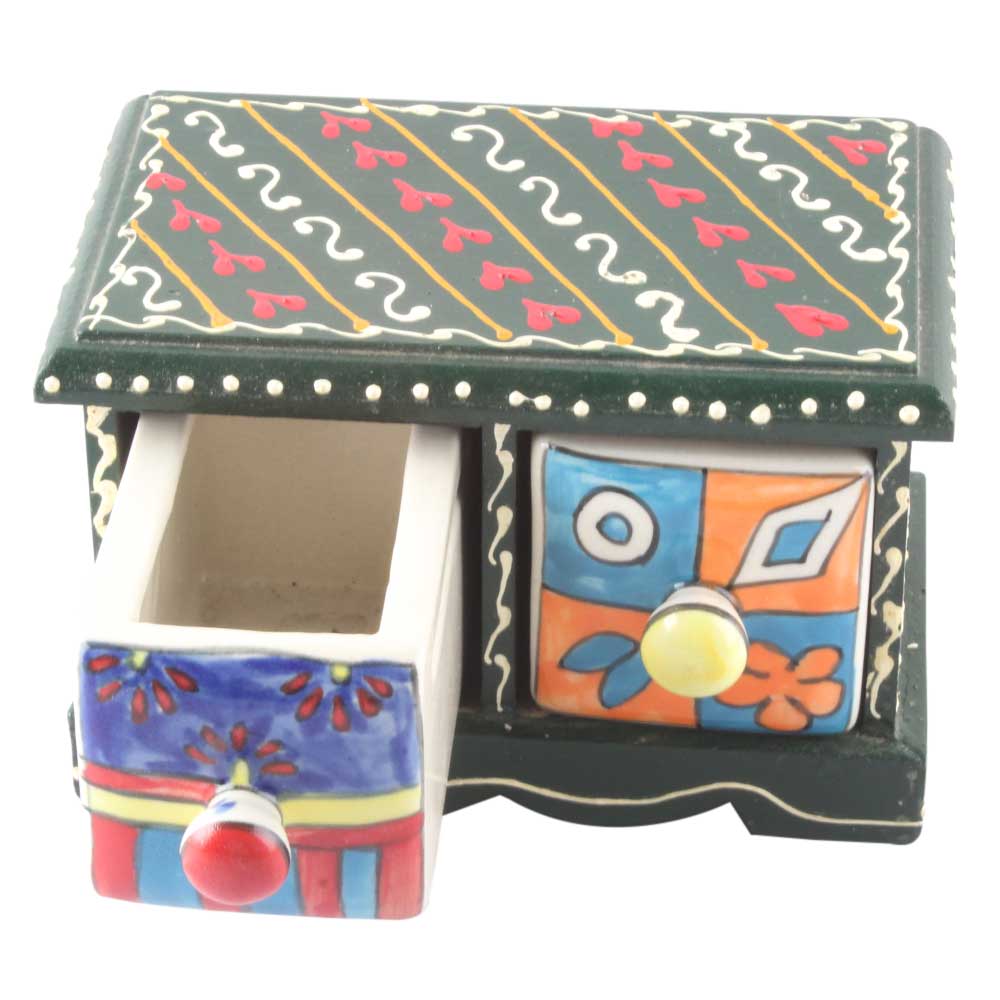 Material: Wood and Ceramic Size: Height: 4 inches, width: 6.5 inches and depth: 3.75 inches Approx Handmade