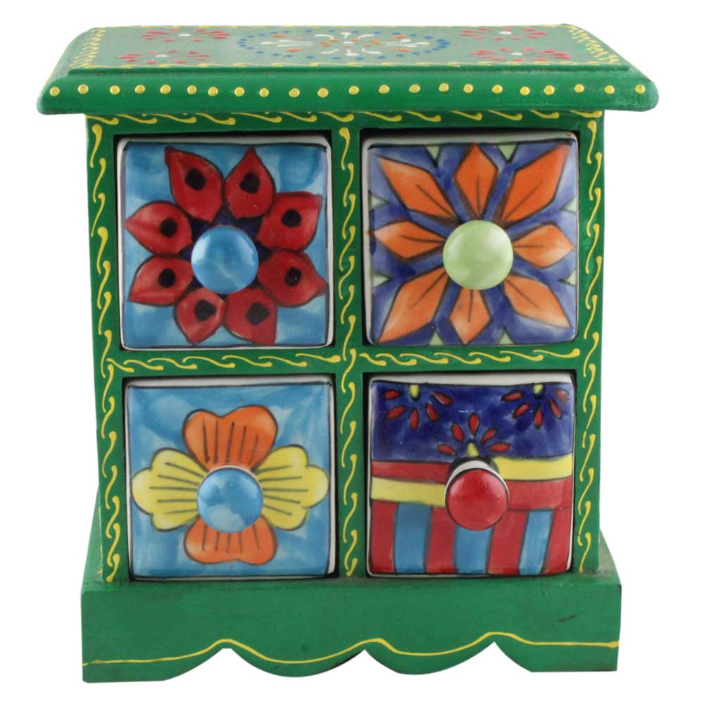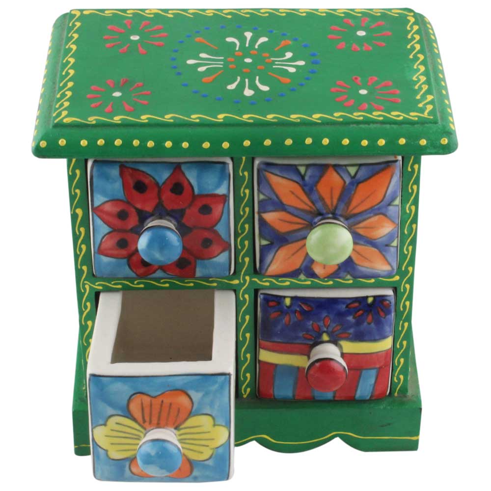 Spice Box-1216 Masala Rack Container Gift Item. Ceramic Drawers in Wooden Frame. The Spice Boxes are designed with different patterns. These boxes are made using natural wood which does not harm the purity of spices.