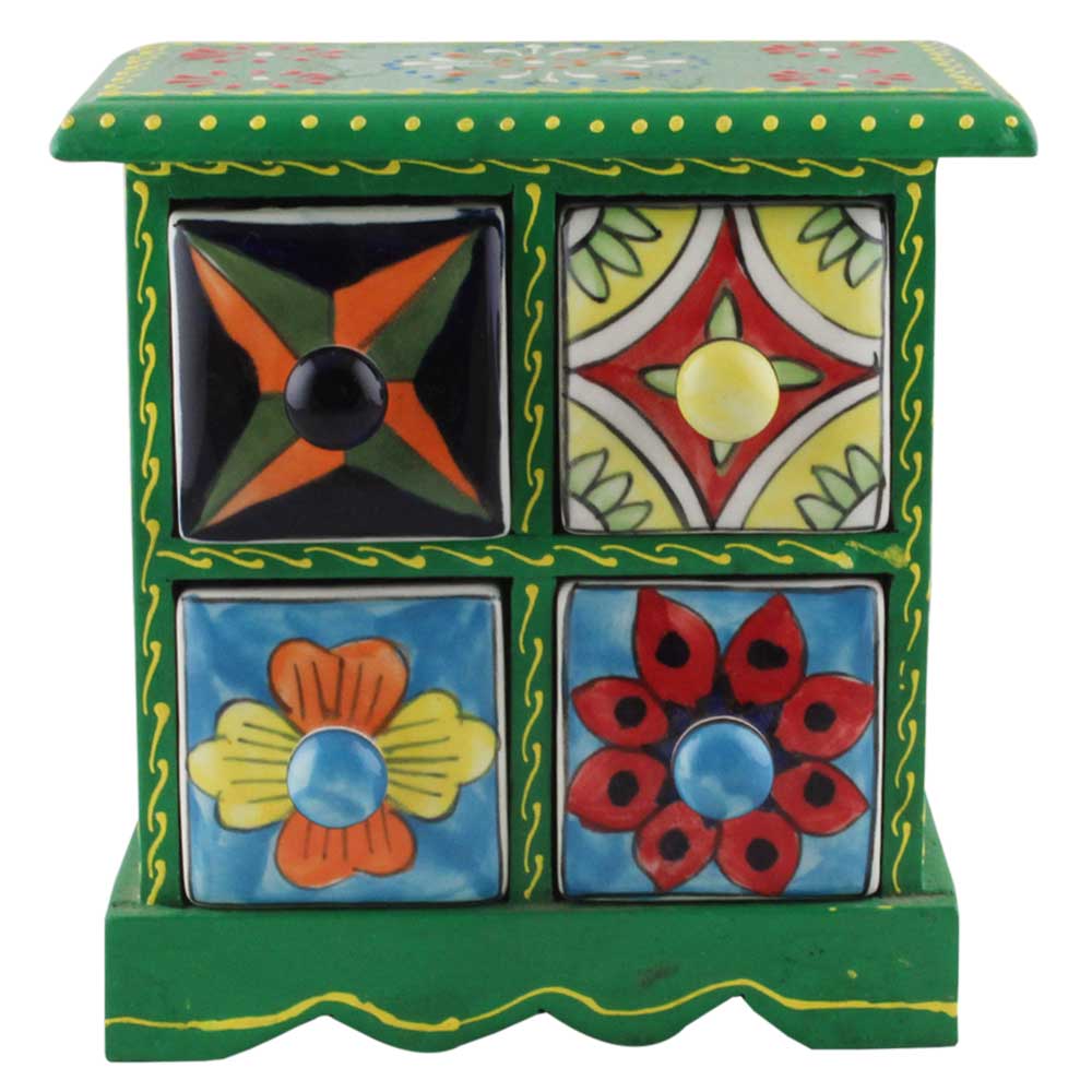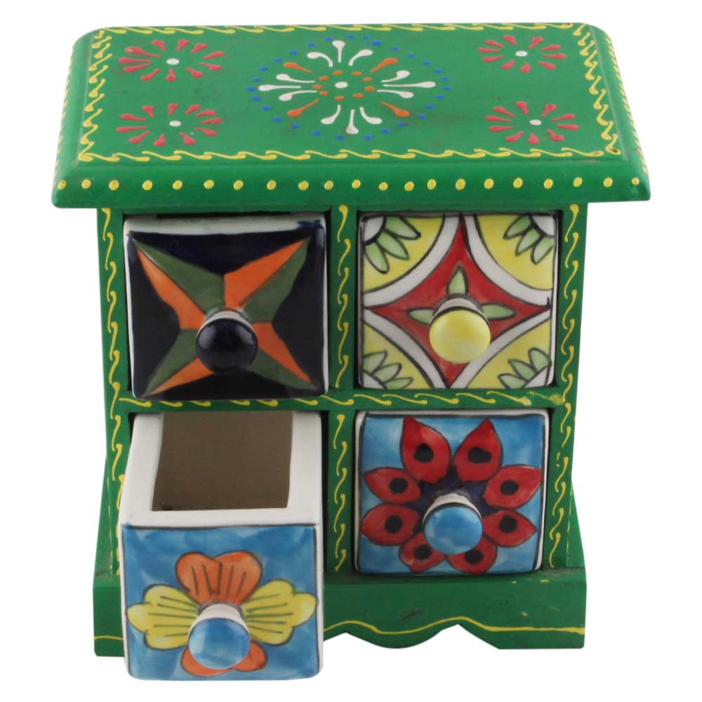 Spice Box-1232 Masala Rack Container Gift Item. Ceramic Drawers in Wooden Frame. The Spice Boxes are designed with different patterns. These boxes are made using natural wood which does not harm the purity of spices.