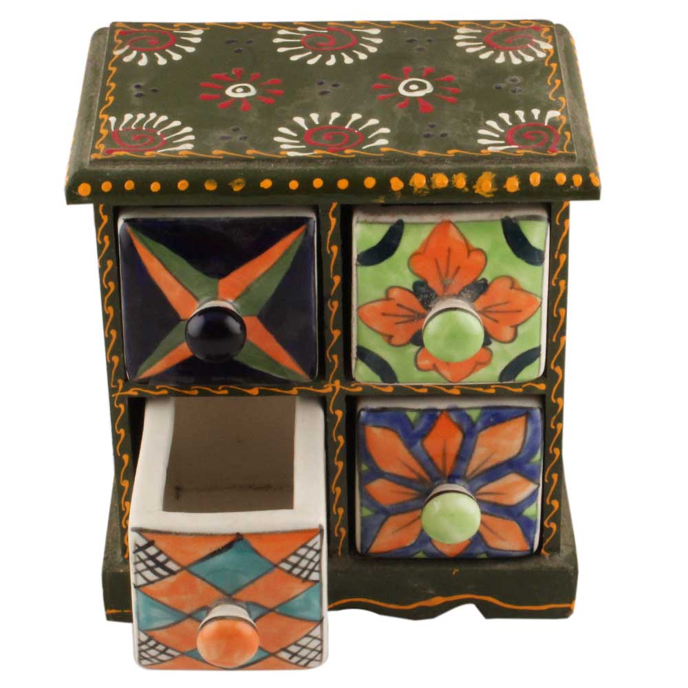 Material: Wood and Ceramic Size: Height: 6.75 inches, width: 6.25 inches and depth: 4.25 inches Approx Handmade