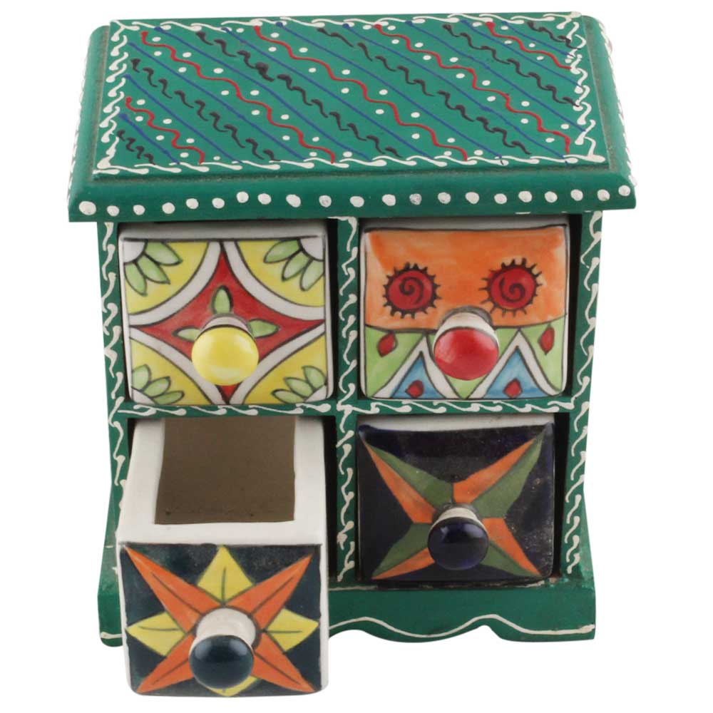 Spice Box-1249 Masala Rack Container Gift Item. Ceramic Drawers in Wooden Frame. The Spice Boxes are designed with different patterns. These boxes are made using natural wood which does not harm the purity of spices.