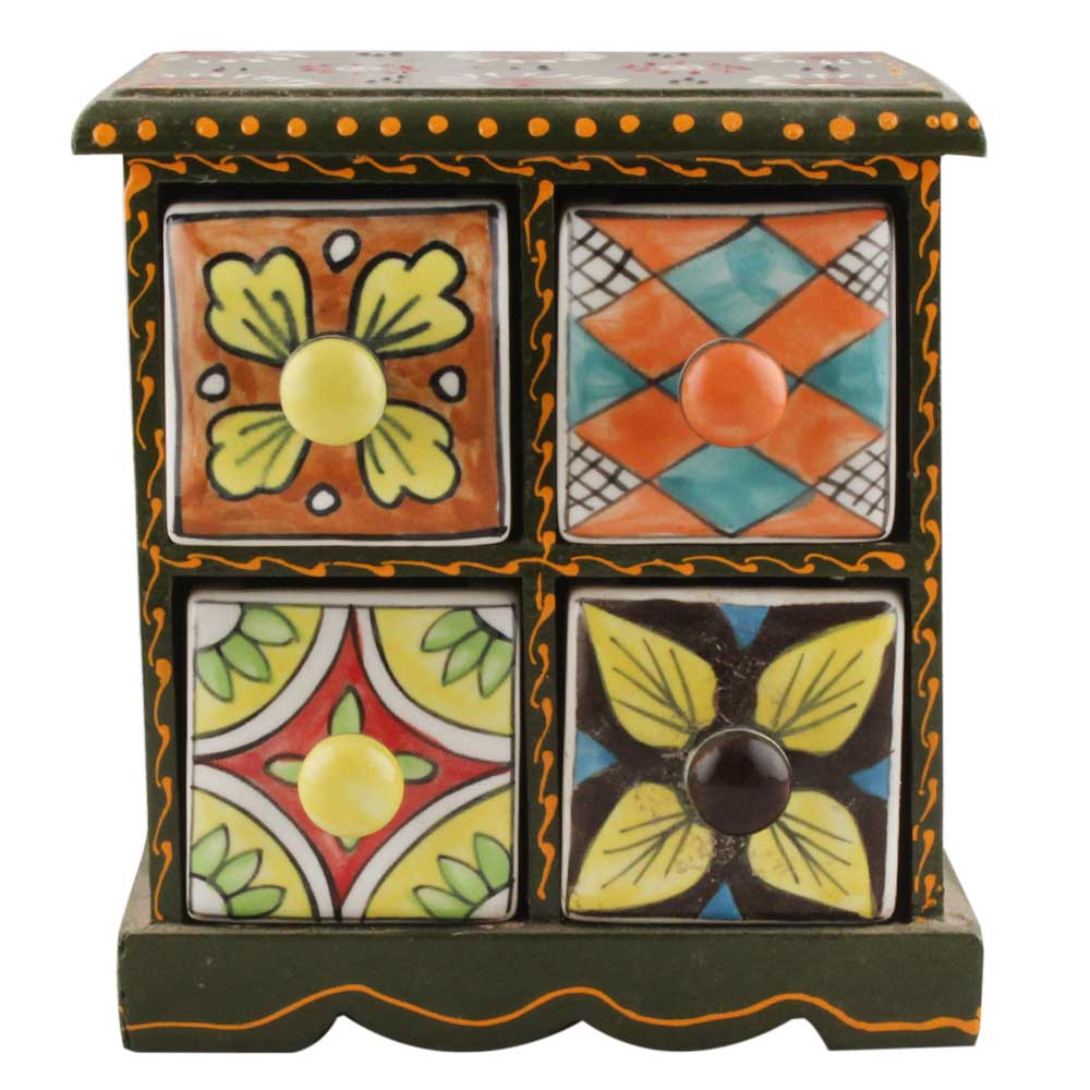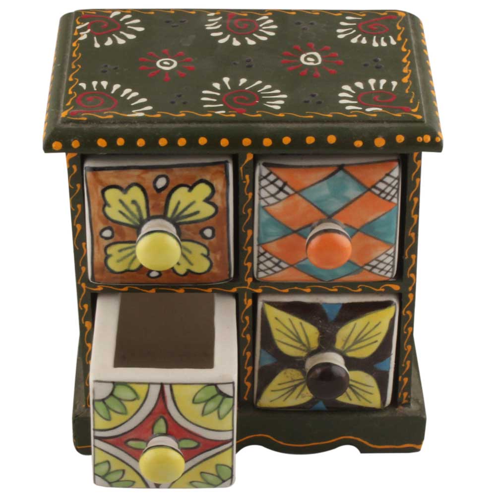 Spice Box-1251 Masala Rack Container Gift Item. Ceramic Drawers in Wooden Frame. The Spice Boxes are designed with different patterns. These boxes are made using natural wood which does not harm the purity of spices.