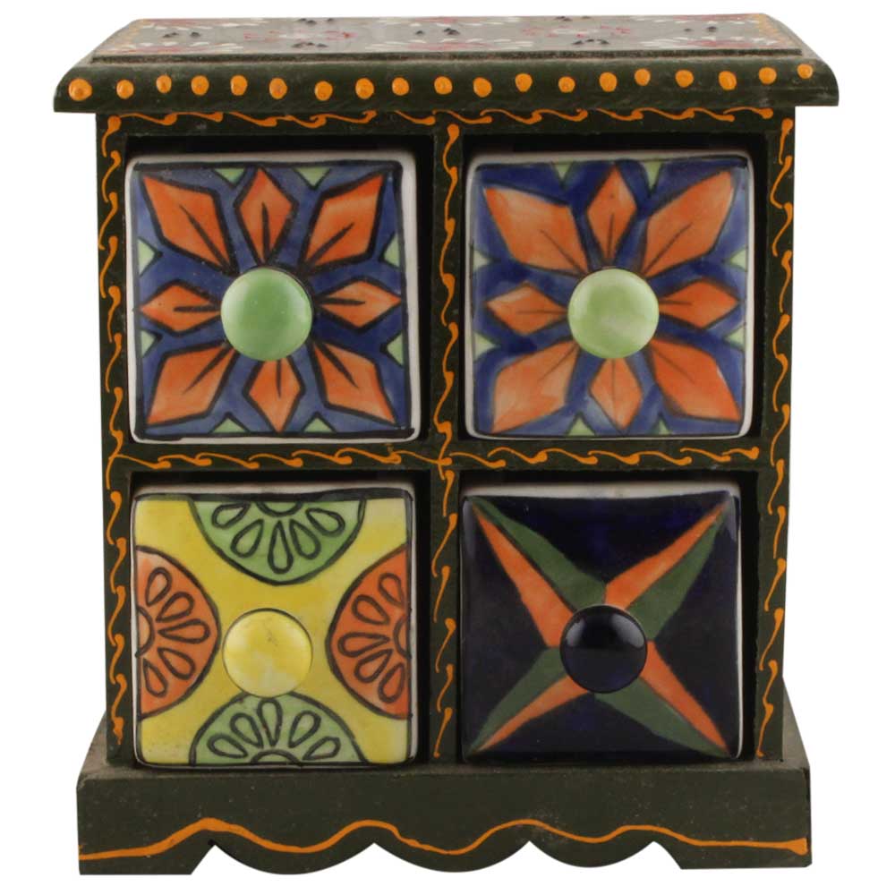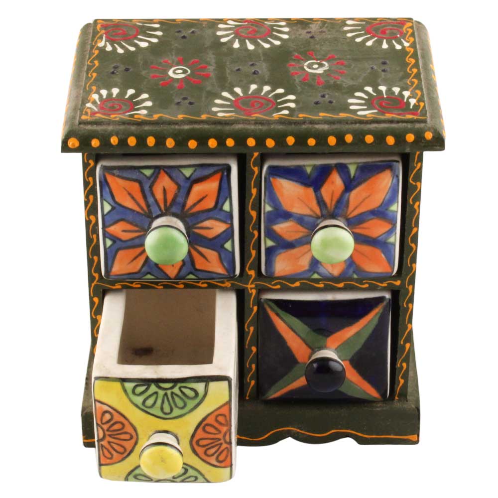 Spice Box-1252 Masala Rack Container Gift Item. Ceramic Drawers in Wooden Frame. The Spice Boxes are designed with different patterns. These boxes are made using natural wood which does not harm the purity of spices.
