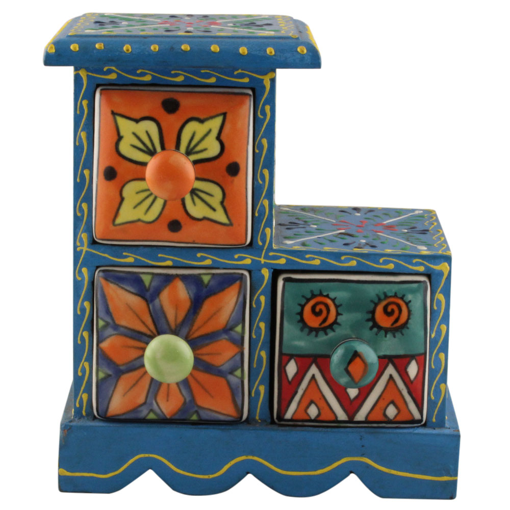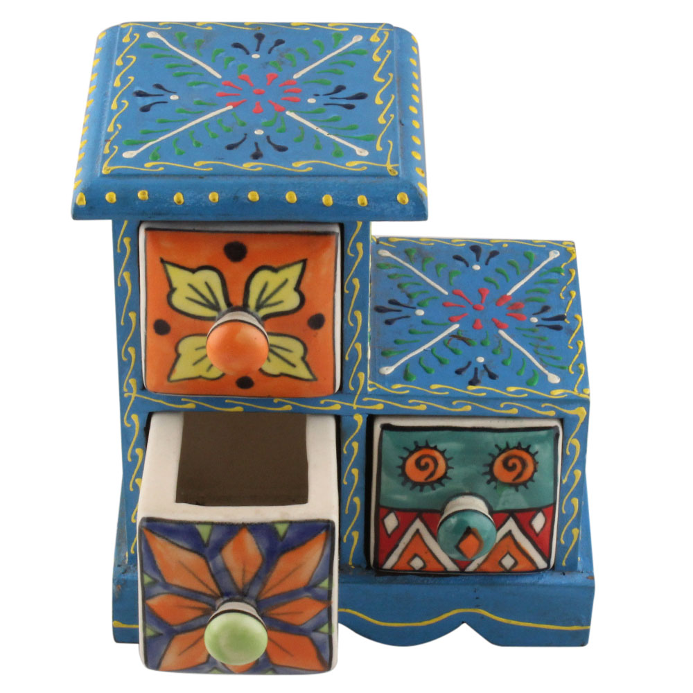 Spice Box-1272 Masala Rack Container Gift Item. Ceramic Drawers in Wooden Frame. The Spice Boxes are designed with different patterns. These boxes are made using natural wood which does not harm the purity of spices.