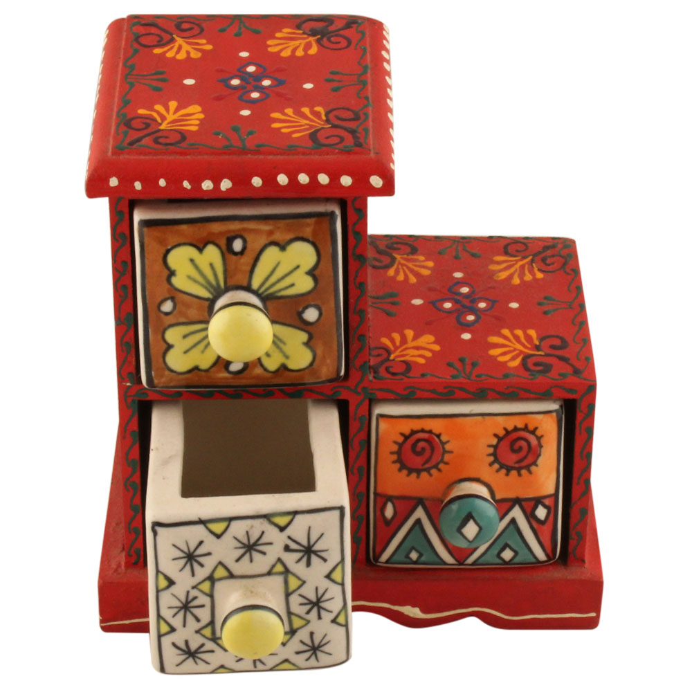 Spice Box-1273 Masala Rack Container Gift Item. Ceramic Drawers in Wooden Frame. The Spice Boxes are designed with different patterns. These boxes are made using natural wood which does not harm the purity of spices.
