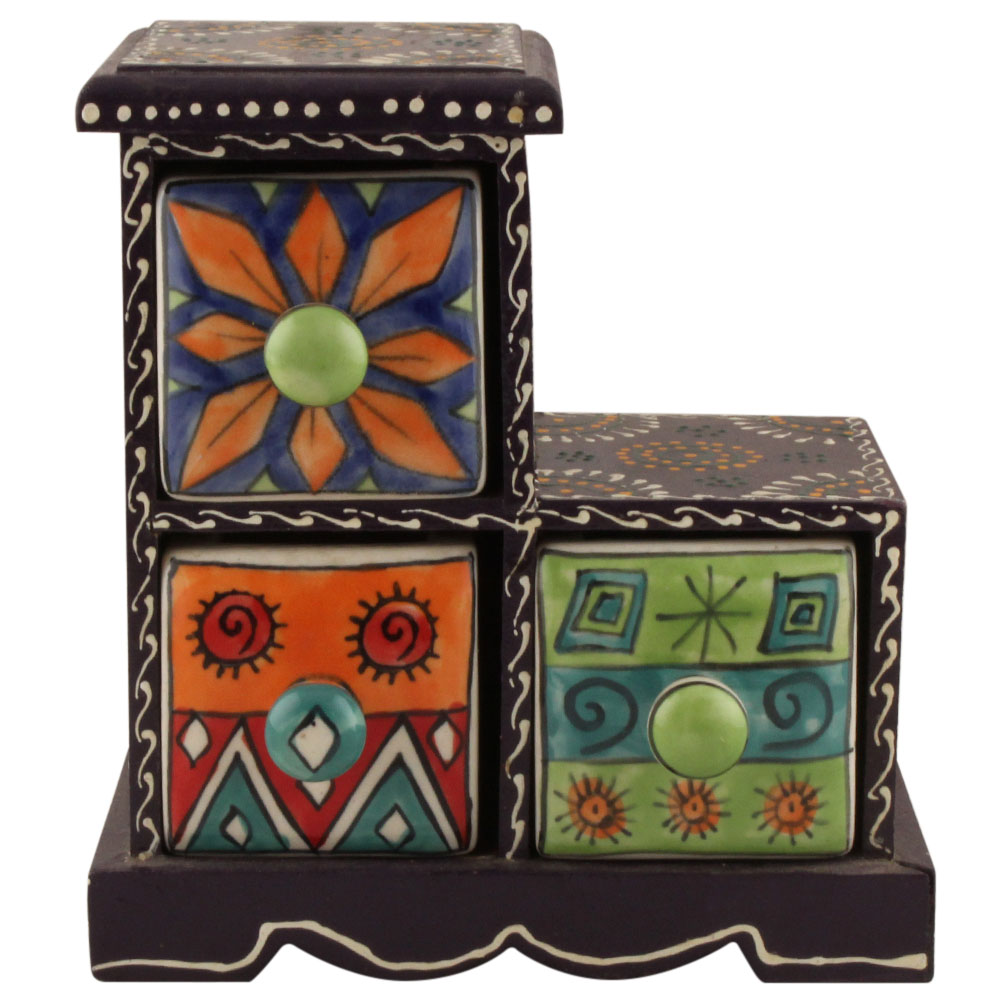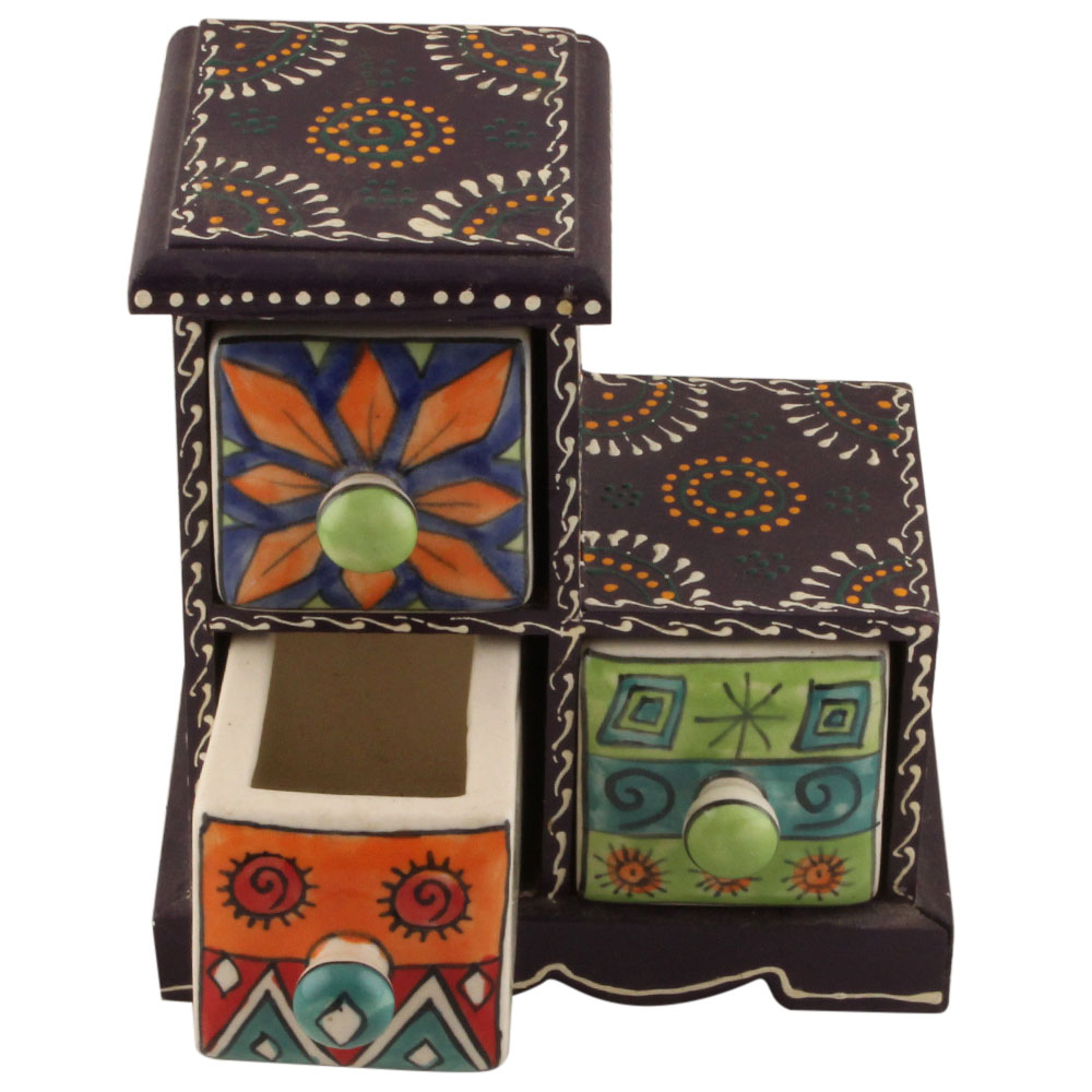 Spice Box-1283 Masala Rack Container Gift Item. Ceramic Drawers in Wooden Frame. The Spice Boxes are designed with different patterns. These boxes are made using natural wood which does not harm the purity of spices.