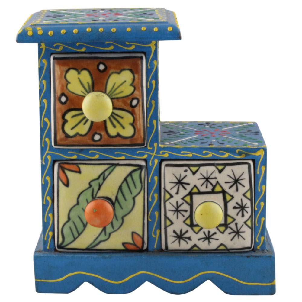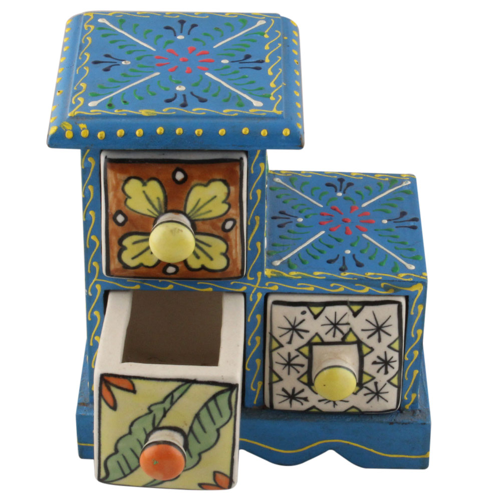 Spice Box-1287 Masala Rack Container Gift Item. Ceramic Drawers in Wooden Frame. The Spice Boxes are designed with different patterns. These boxes are made using natural wood which does not harm the purity of spices.