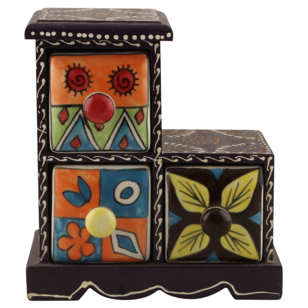 Spice Box-1289 Masala Rack Container Gift Item. Ceramic Drawers in Wooden Frame. The Spice Boxes are designed with different patterns. These boxes are made using natural wood which does not harm the purity of spices.