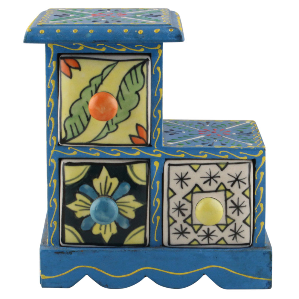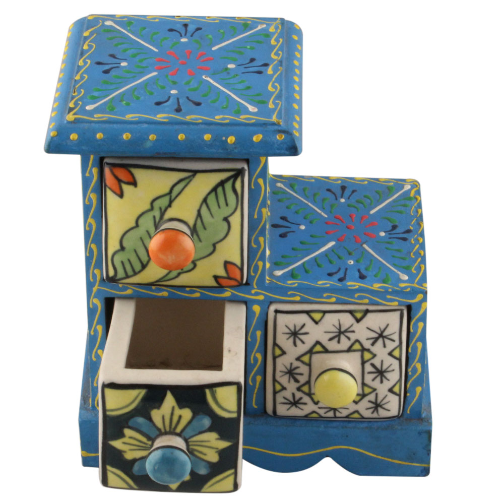 Spice Box-1290 Masala Rack Container Gift Item. Ceramic Drawers in Wooden Frame. The Spice Boxes are designed with different patterns. These boxes are made using natural wood which does not harm the purity of spices.