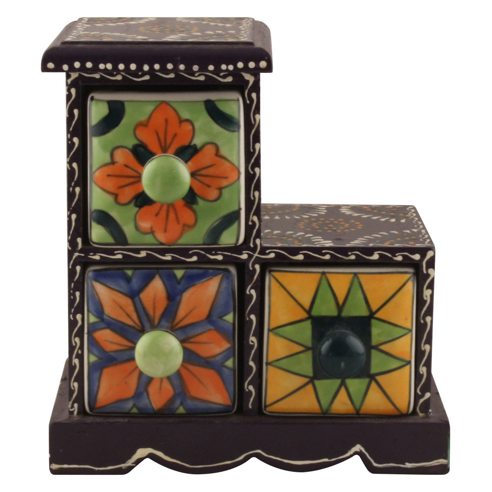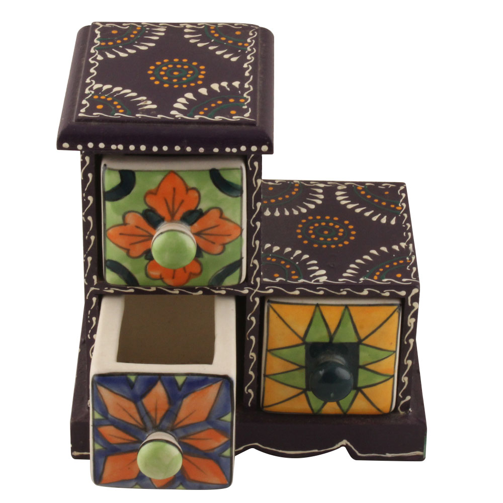 Spice Box-1303 Masala Rack Container Gift Item. Ceramic Drawers in Wooden Frame. The Spice Boxes are designed with different patterns. These boxes are made using natural wood which does not harm the purity of spices.
