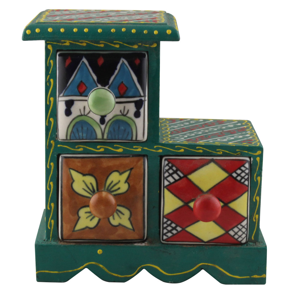 Spice Box-1317 Masala Rack Container Gift Item. Ceramic Drawers in Wooden Frame. The Spice Boxes are designed with different patterns. These boxes are made using natural wood which does not harm the purity of spices.