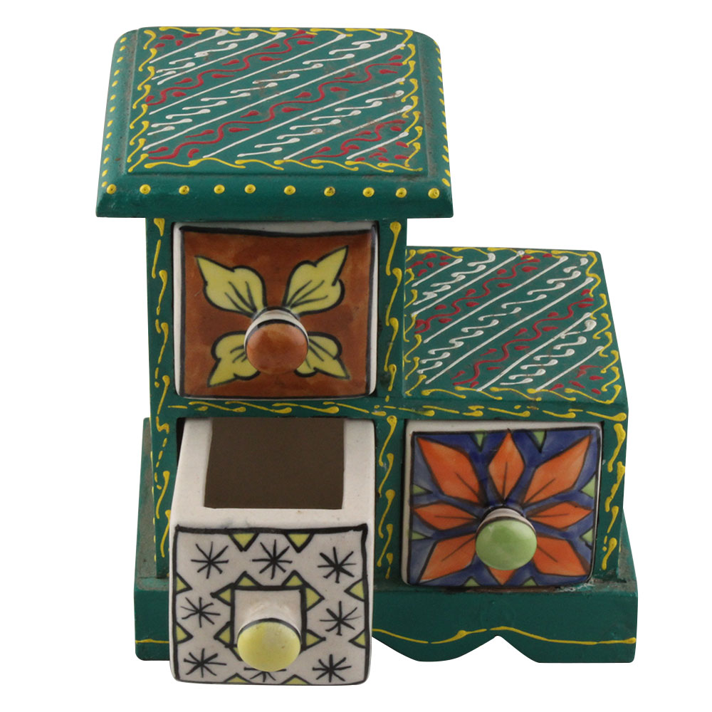 Spice Box-1318 Masala Rack Container Gift Item. Ceramic Drawers in Wooden Frame. The Spice Boxes are designed with different patterns. These boxes are made using natural wood which does not harm the purity of spices.
