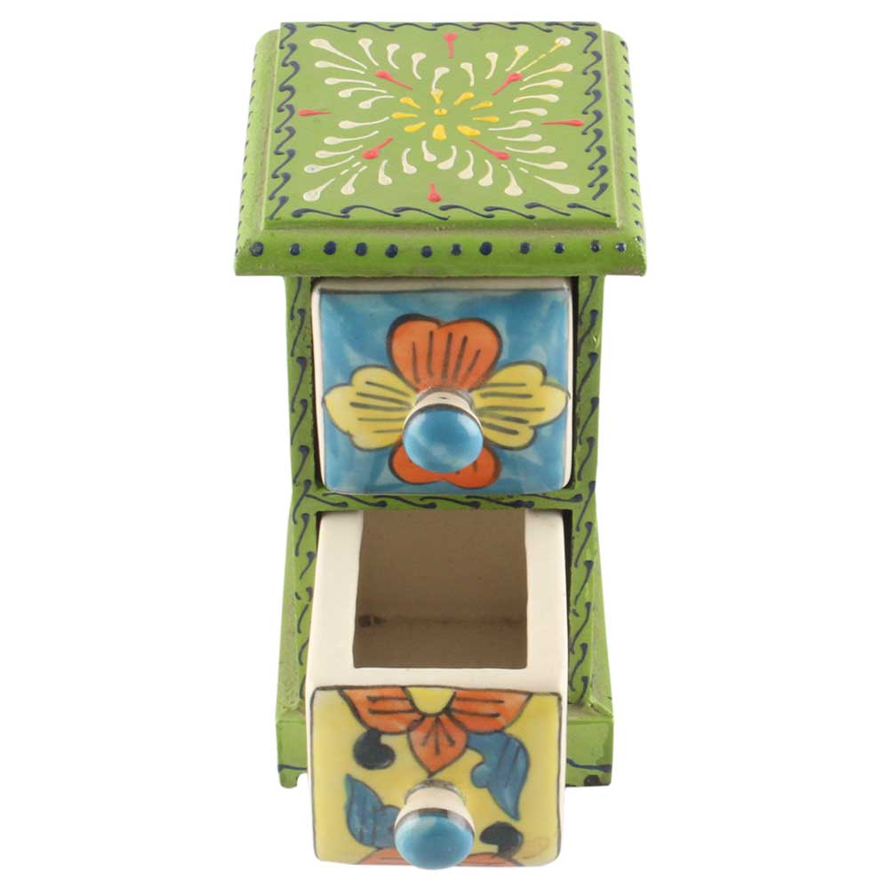 Material: Wood and Ceramic Size: Height: 6.75 inches, width: 6.25 inches and depth: 4.25 inches Approx Handmade