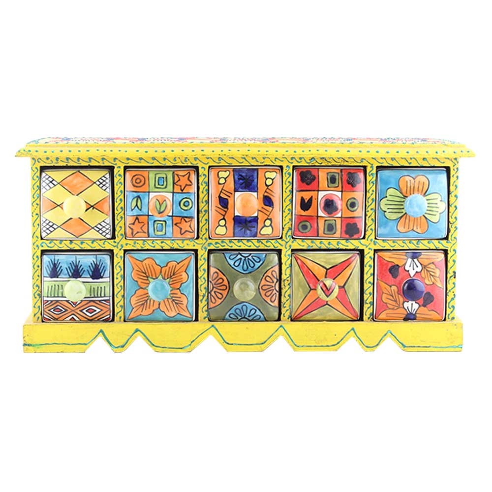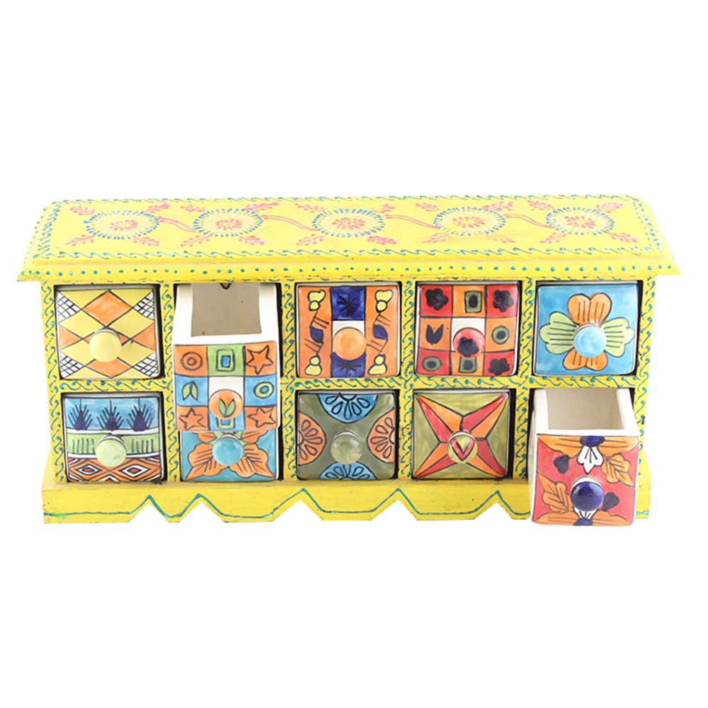 Spice Box-830 Masala Rack Container Gift Item. Ceramic Drawers in Wooden Frame. The Spice Boxes are designed with different patterns. These boxes are made using natural wood which does not harm the purity of spices.