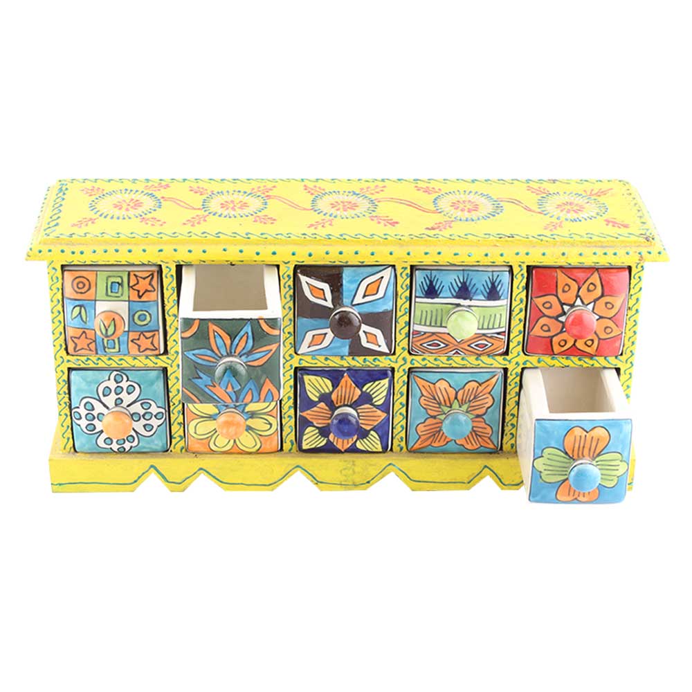 Spice Box-831 Masala Rack Container Gift Item. Ceramic Drawers in Wooden Frame. The Spice Boxes are designed with different patterns. These boxes are made using natural wood which does not harm the purity of spices.