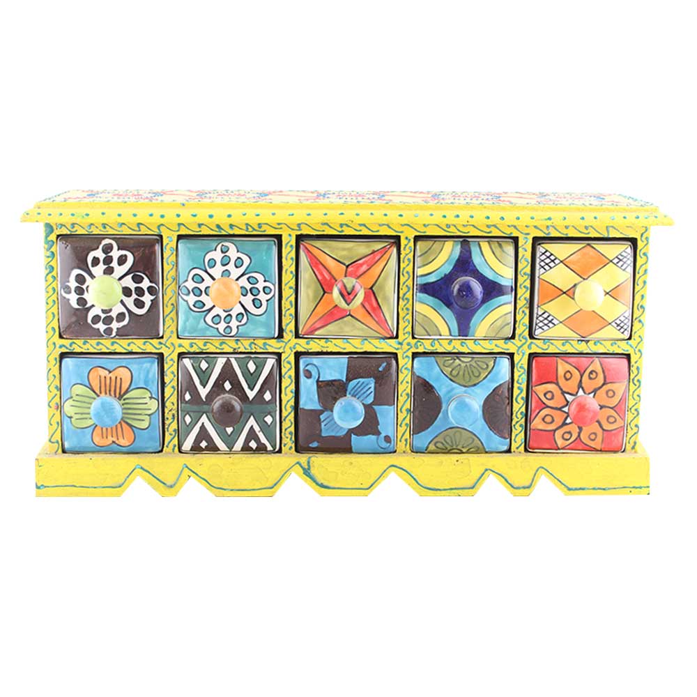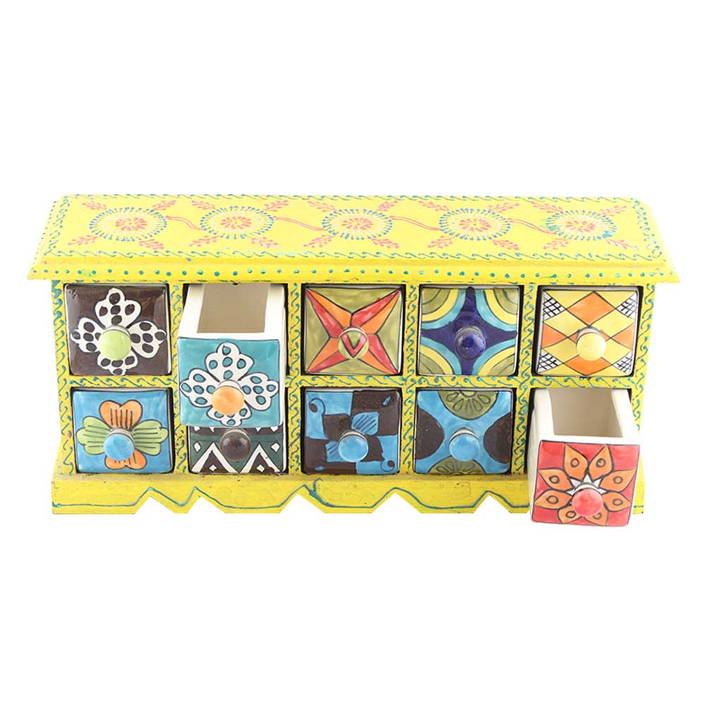 Spice Box-832 Masala Rack Container Gift Item. Ceramic Drawers in Wooden Frame. The Spice Boxes are designed with different patterns. These boxes are made using natural wood which does not harm the purity of spices.