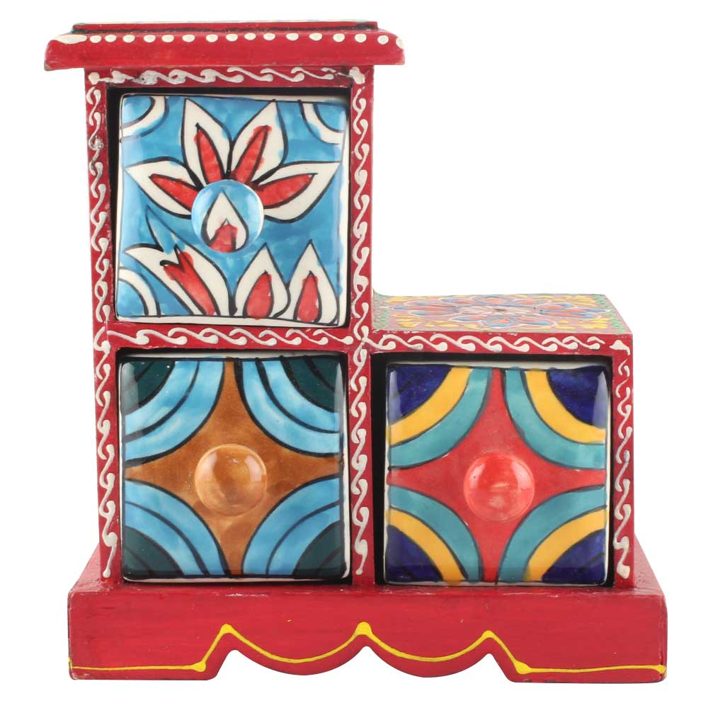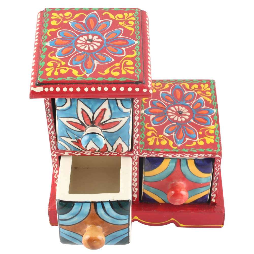 Spice Box-962 Masala Rack Container Gift Item. Ceramic Drawers in Wooden Frame. The Spice Boxes are designed with different patterns. These boxes are made using natural wood which does not harm the purity of spices.