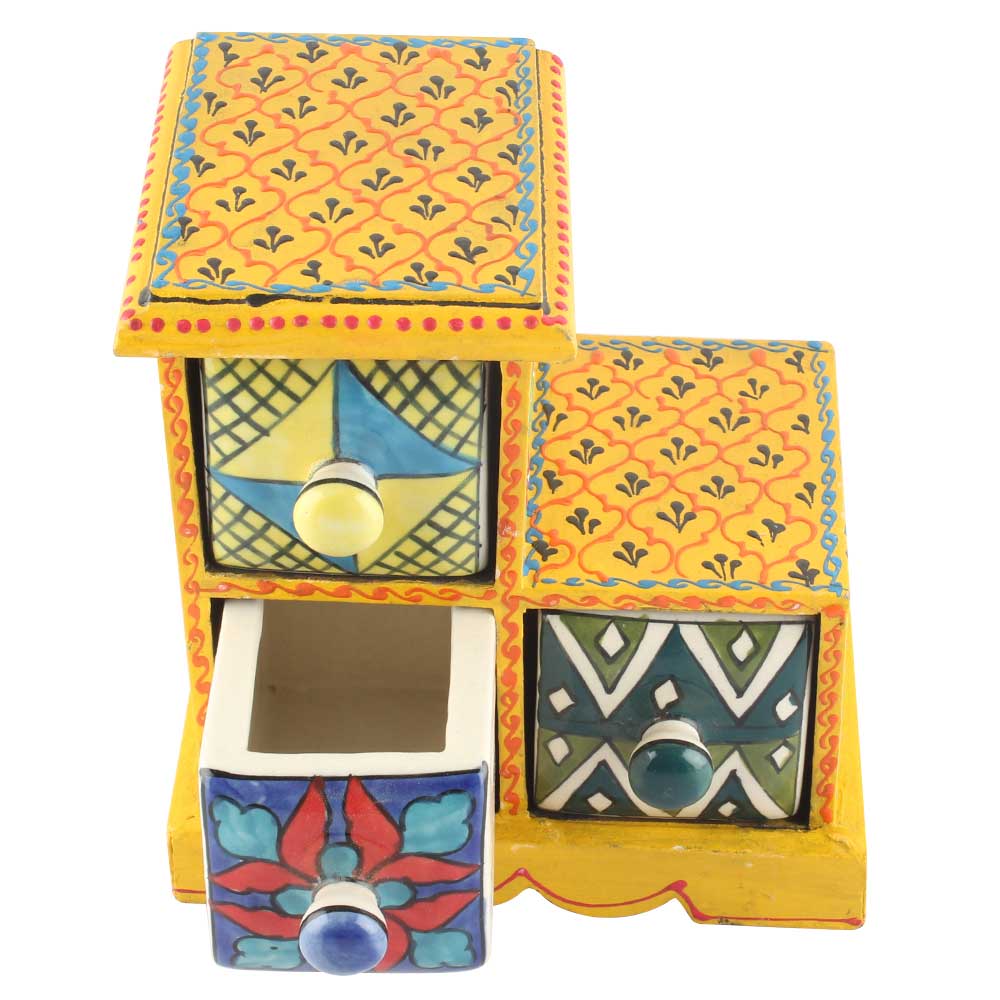 Spice Box-985 Masala Rack Container Gift Item. Ceramic Drawers in Wooden Frame. The Spice Boxes are designed with different patterns. These boxes are made using natural wood which does not harm the purity of spices.