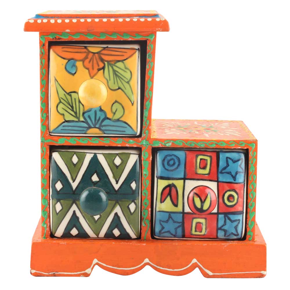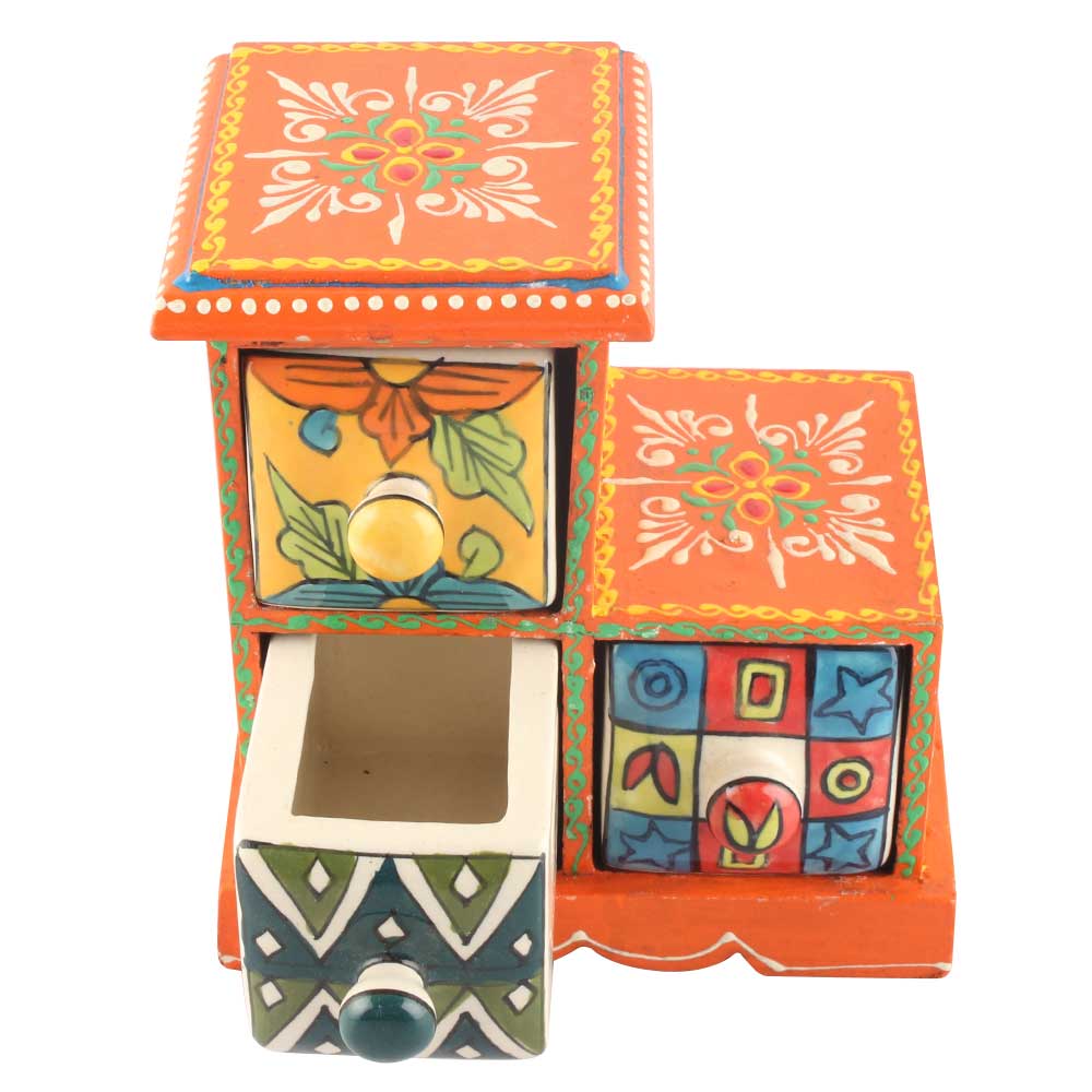 Spice Box-990 Masala Rack Container Gift Item. Ceramic Drawers in Wooden Frame. The Spice Boxes are designed with different patterns. These boxes are made using natural wood which does not harm the purity of spices.