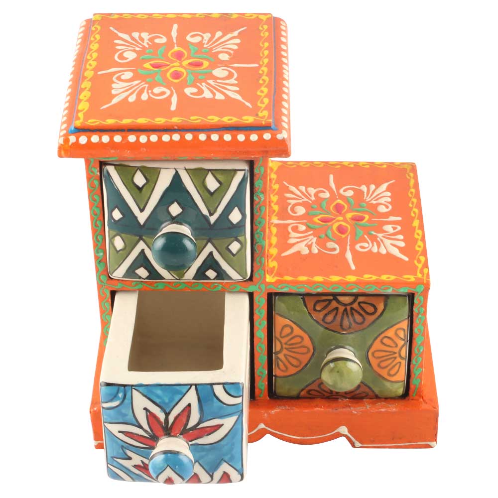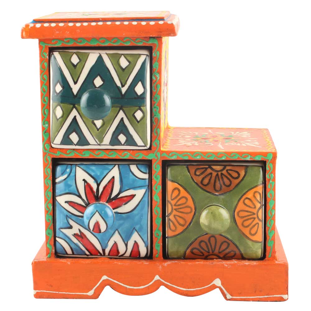 Spice Box-992 Masala Rack Container Gift Item. Ceramic Drawers in Wooden Frame. The Spice Boxes are designed with different patterns. These boxes are made using natural wood which does not harm the purity of spices.