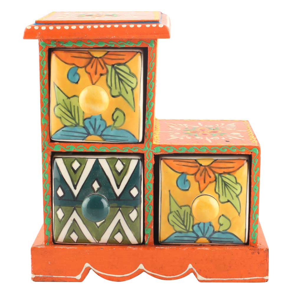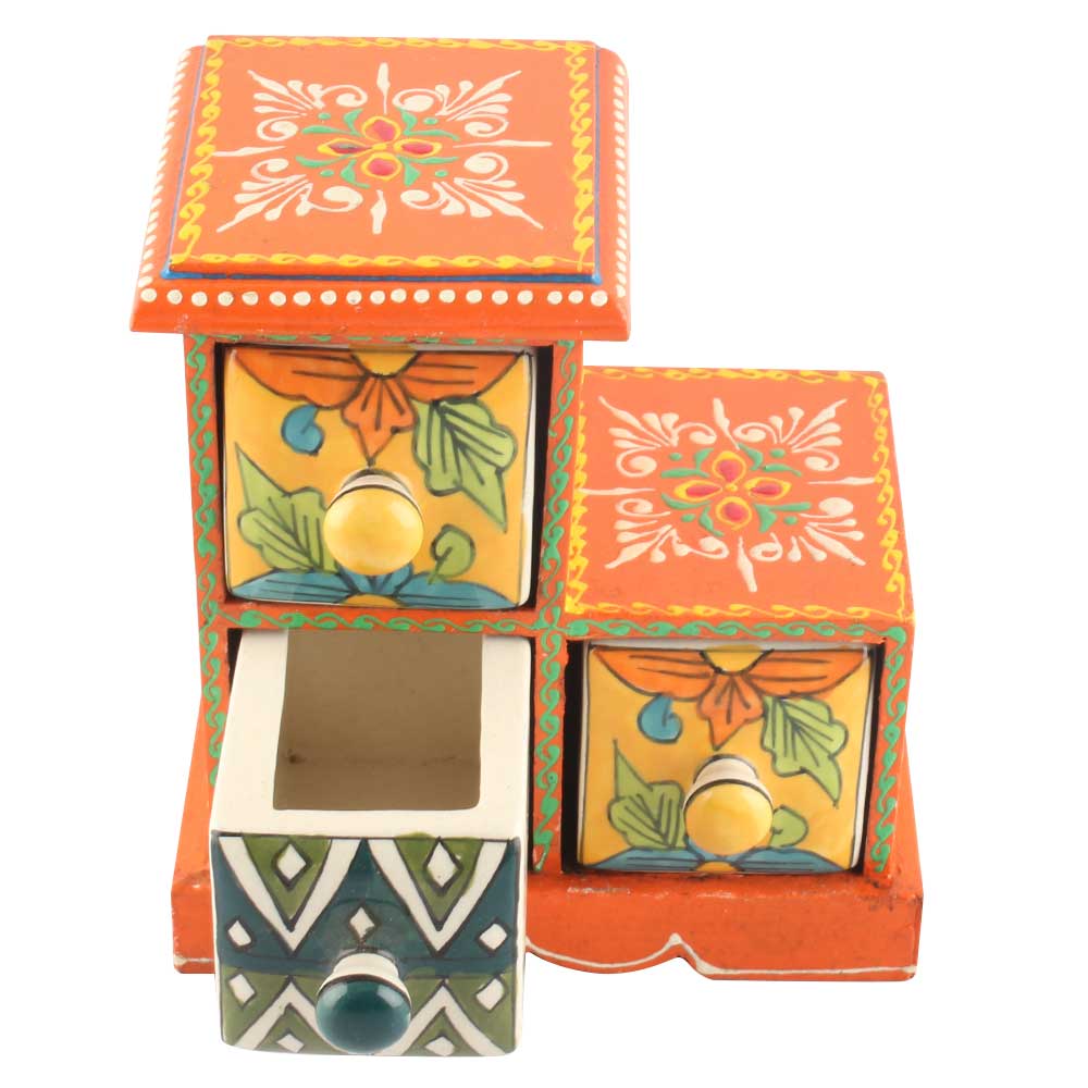 Spice Box-994 Masala Rack Container Gift Item. Ceramic Drawers in Wooden Frame. The Spice Boxes are designed with different patterns. These boxes are made using natural wood which does not harm the purity of spices.