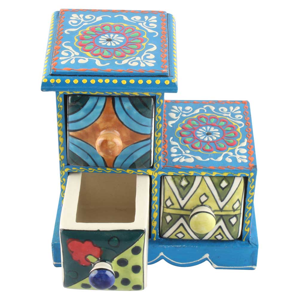 Spice Box-1003 Masala Rack Container Gift Item. Ceramic Drawers in Wooden Frame. The Spice Boxes are designed with different patterns. These boxes are made using natural wood which does not harm the purity of spices.