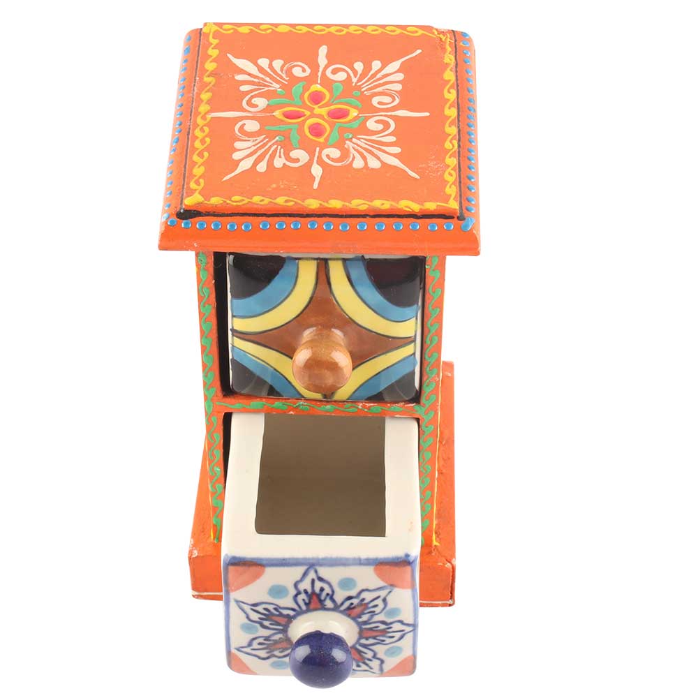 Spice Box-1012 Masala Rack Container Gift Item. Ceramic Drawers in Wooden Frame. The Spice Boxes are designed with different patterns. These boxes are made using natural wood which does not harm the purity of spices.