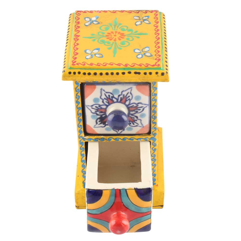 Spice Box-1017 Masala Rack Container Gift Item. Ceramic Drawers in Wooden Frame. The Spice Boxes are designed with different patterns. These boxes are made using natural wood which does not harm the purity of spices.