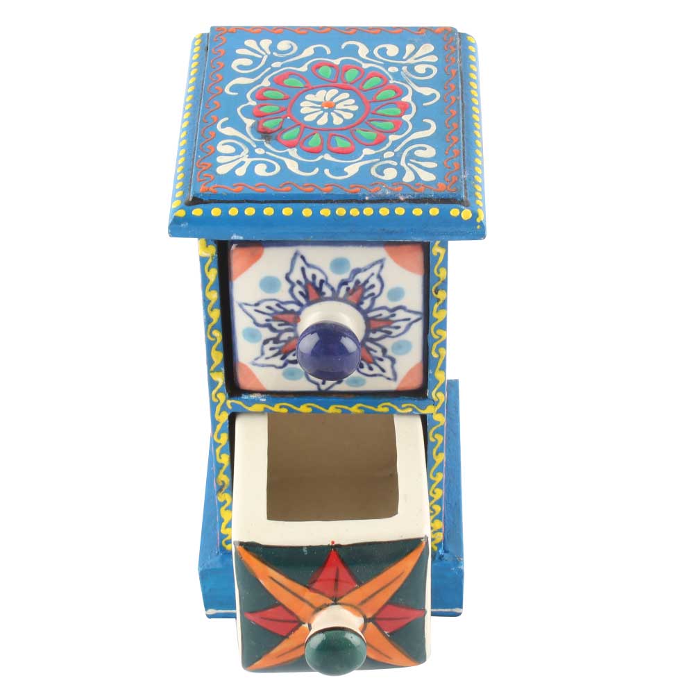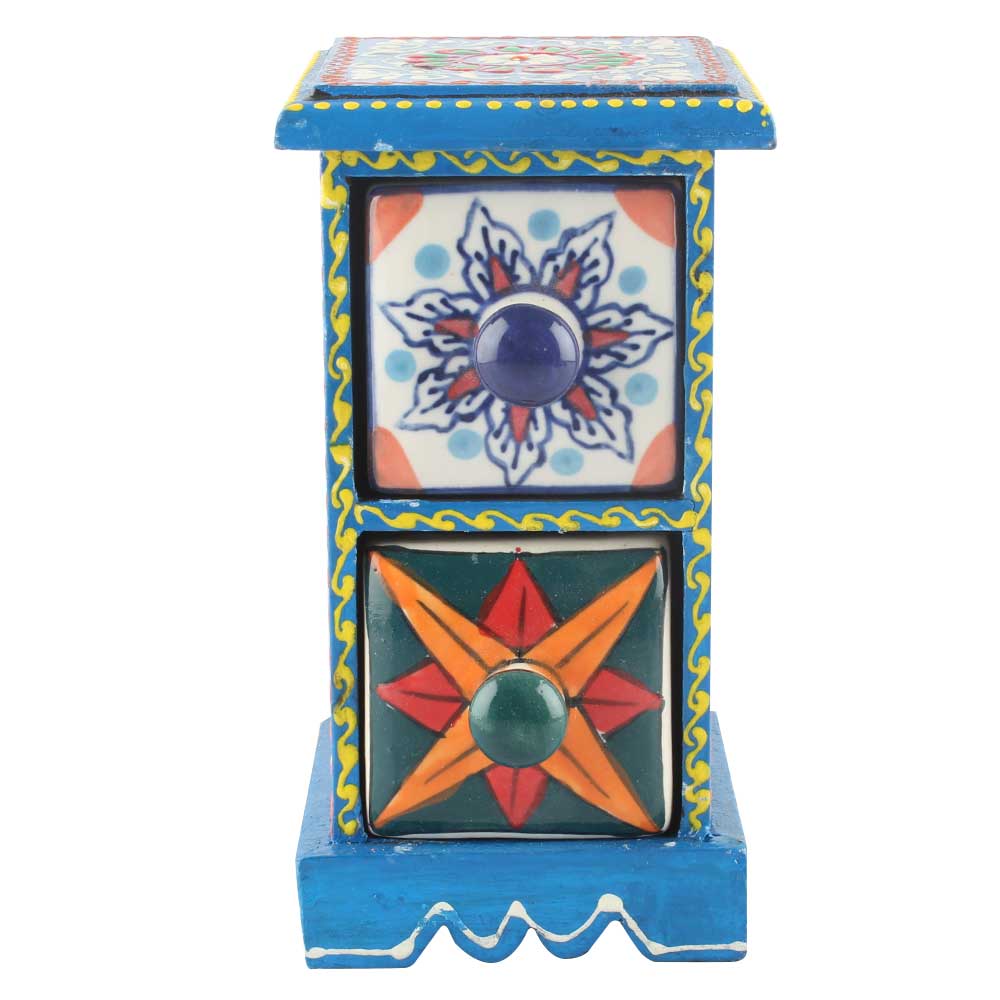 Spice Box-1044 Masala Rack Container Gift Item. Ceramic Drawers in Wooden Frame. The Spice Boxes are designed with different patterns. These boxes are made using natural wood which does not harm the purity of spices.