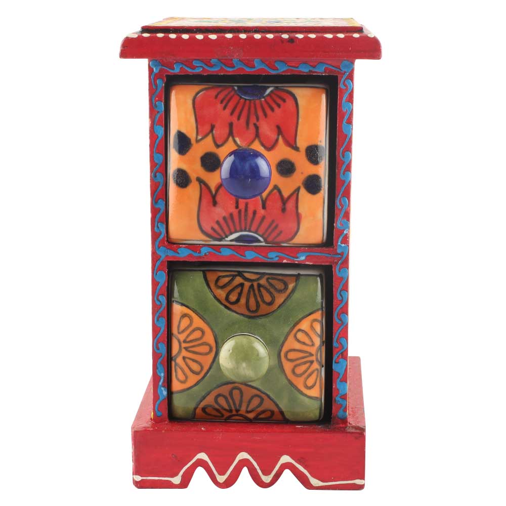 Spice Box-1049 Masala Rack Container Gift Item. Ceramic Drawers in Wooden Frame. The Spice Boxes are designed with different patterns. These boxes are made using natural wood which does not harm the purity of spices.