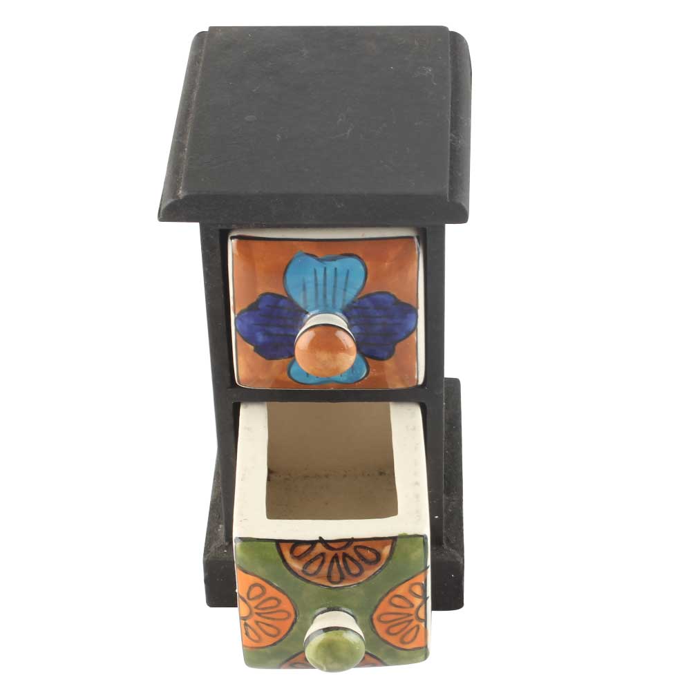 Spice Box-1059 Masala Rack Container Gift Item. Ceramic Drawers in Wooden Frame. The Spice Boxes are designed with different patterns. These boxes are made using natural wood which does not harm the purity of spices.